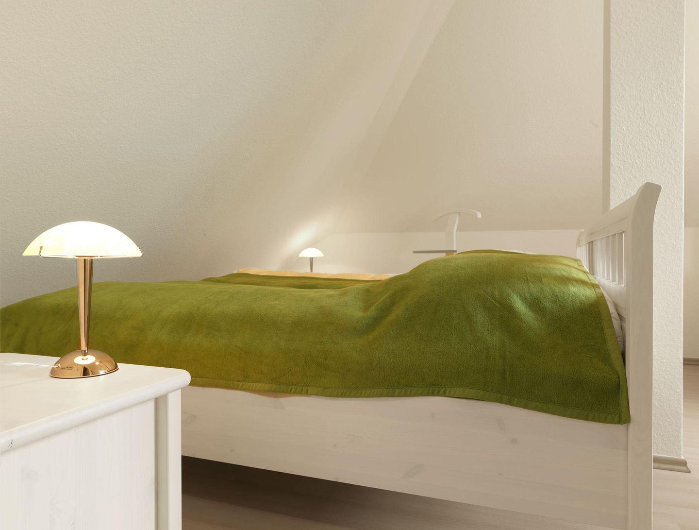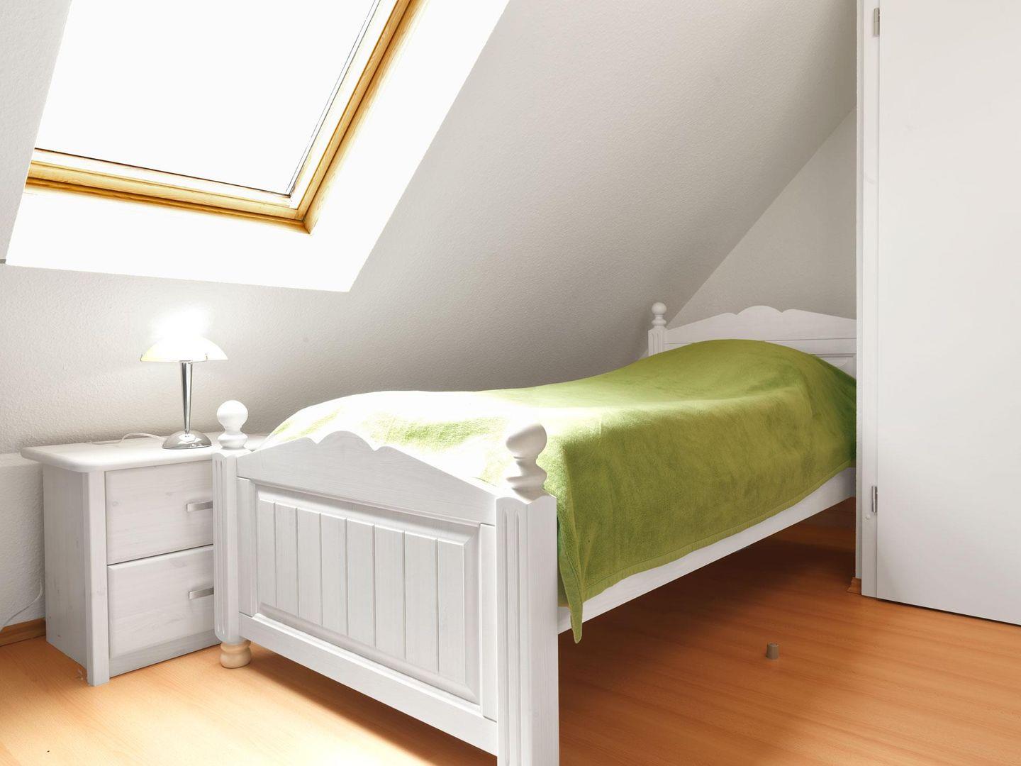 Das großzügige Schlafzimmer mit Verdunkelungsmöglichkeit liegt im Spitzboden über dem Wohnzimmer. Hier finden Sie ein Doppelbett, zwei Einzelbetten, 2.TV und einen begehbaren Kleiderschrank.