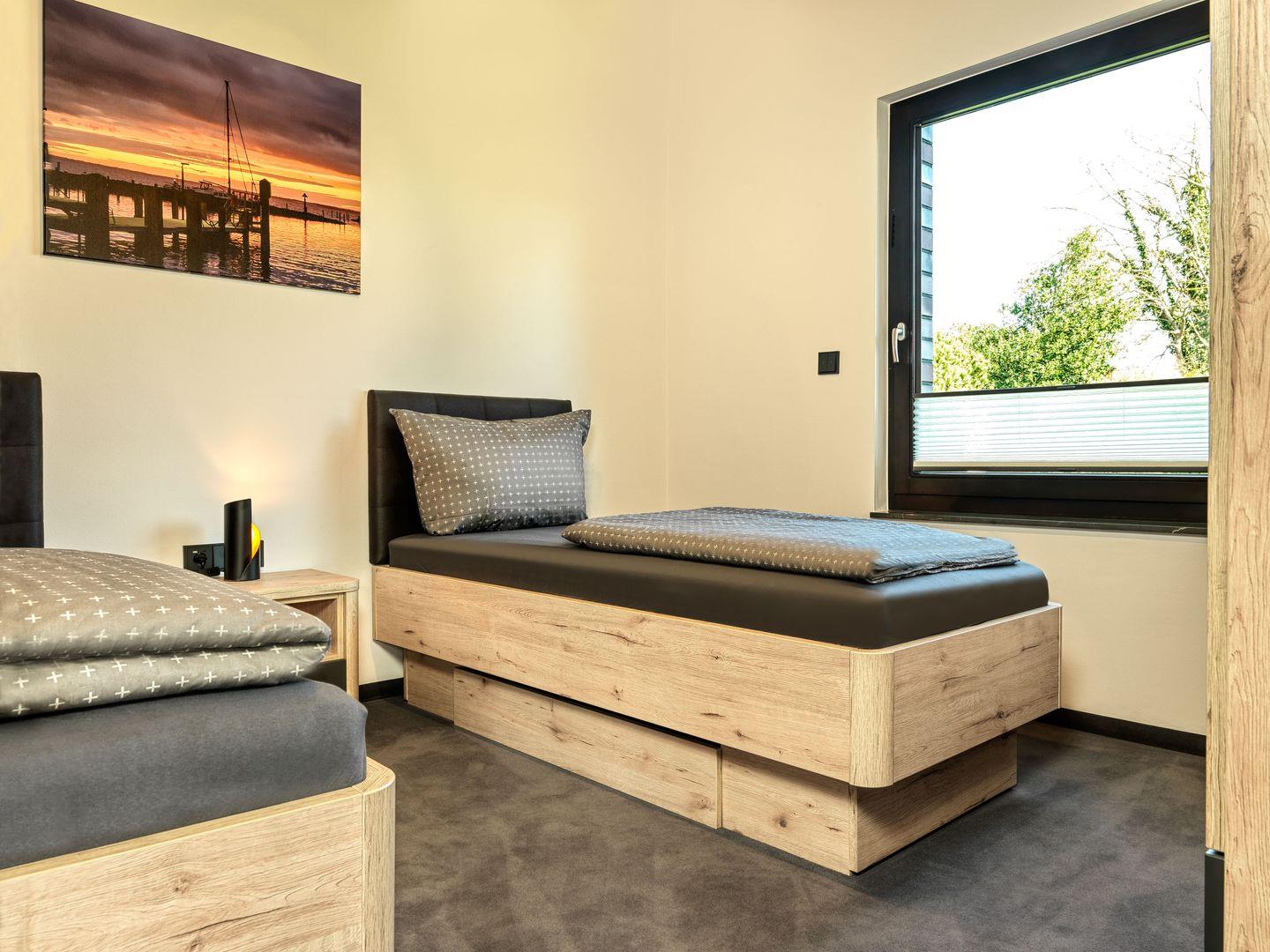 Ein Schlafzimmer mit zwei Einzelbetten für zwei Personen, ein Bad mit großer Dusche und WC, eine voll ausgestattete Küche mit Mikrowelle/ Backofen/ Ceran Kochfeld/ Geschirrspüler und Kühl-Gefrierkombination erwartet Sie im EG.