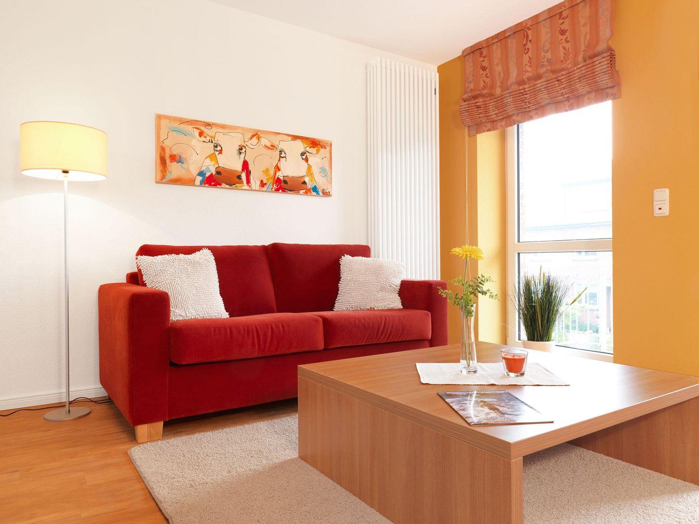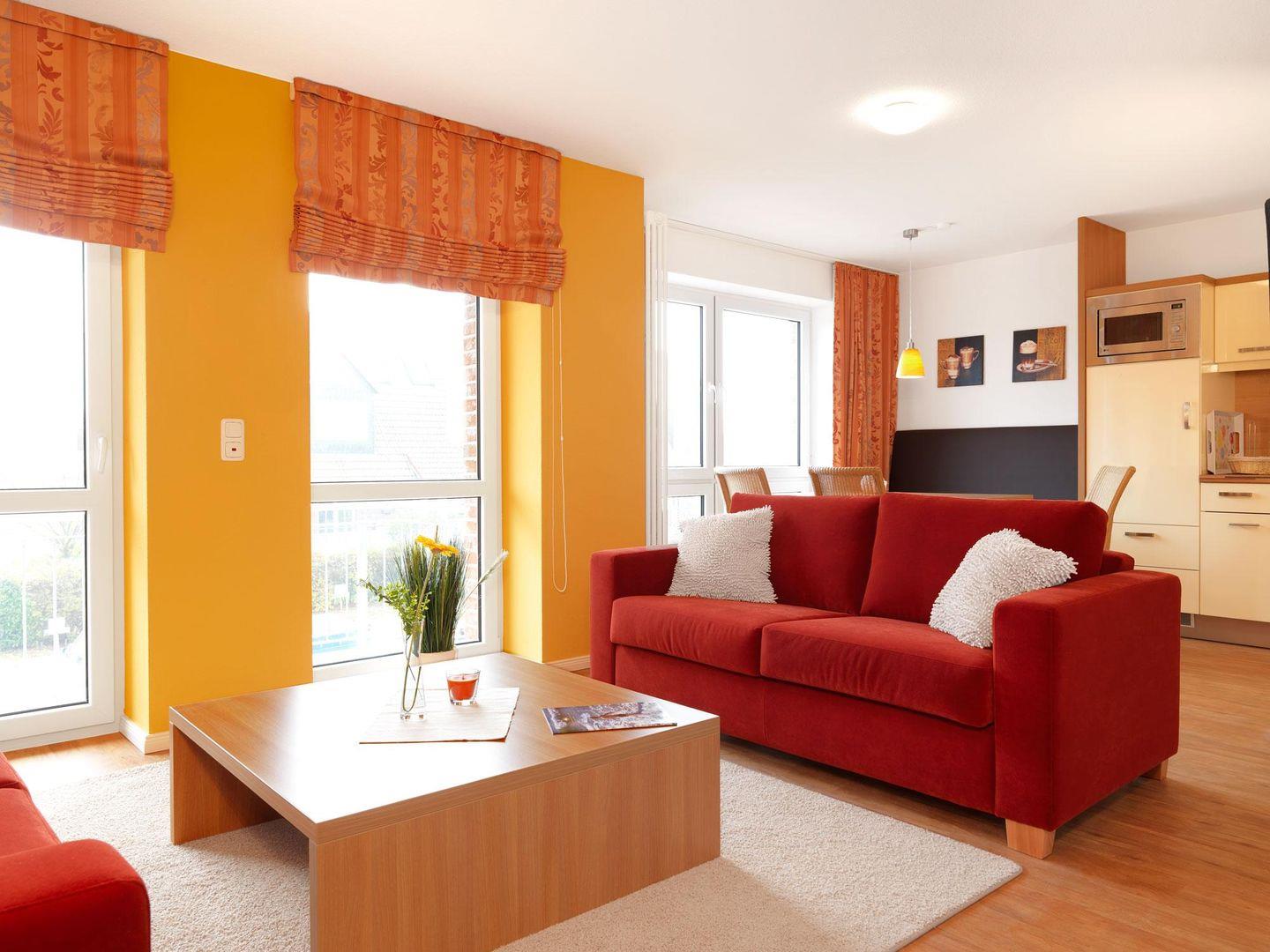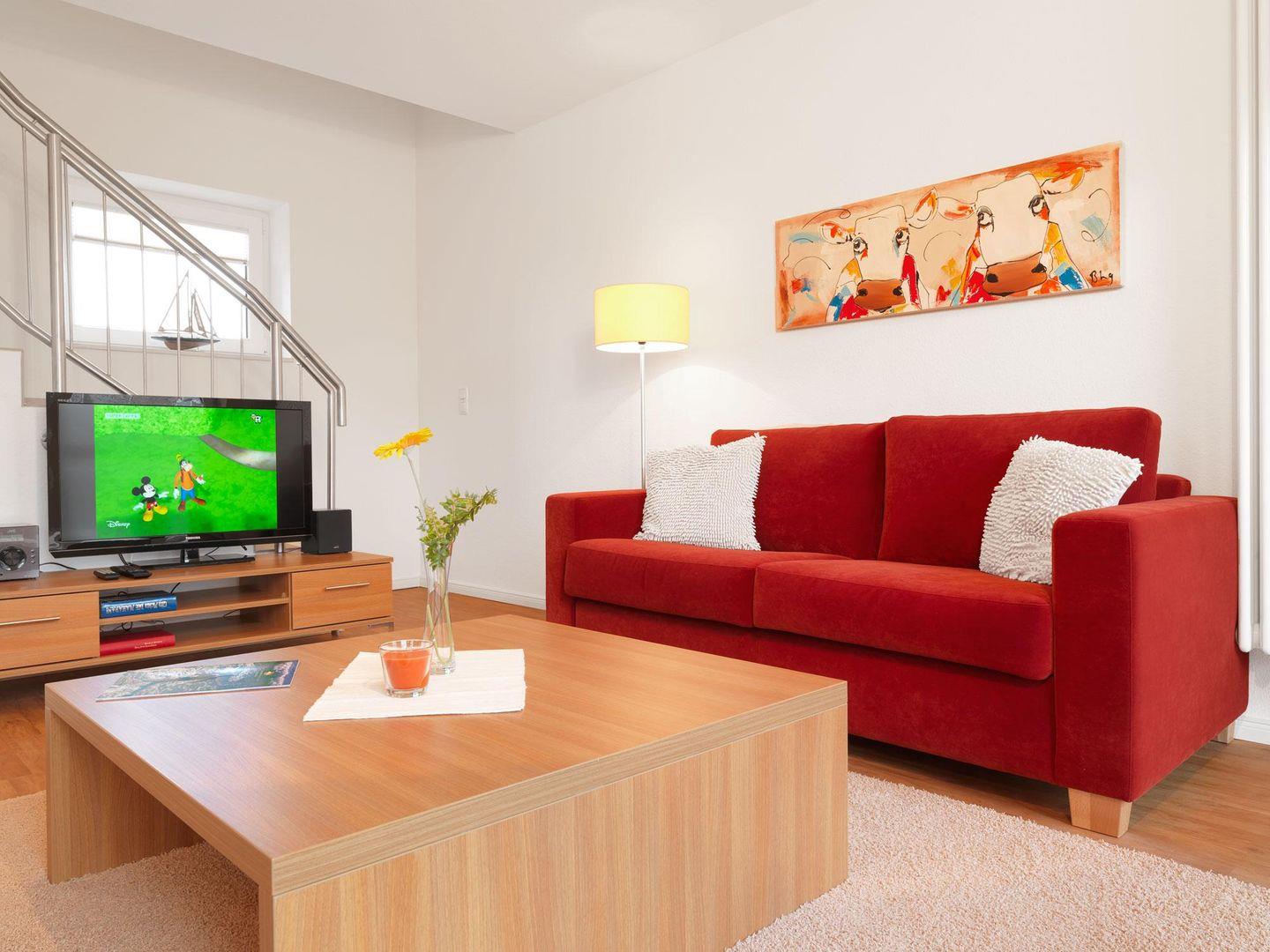Ein schönes Wohnzimmer mit offener Küche mit Eßbereich sowie einem Balkon, der seitlich zum Hafen ausgerichtet ist und ein Gäste WC erwarten Sie auf der ersten Ebene!