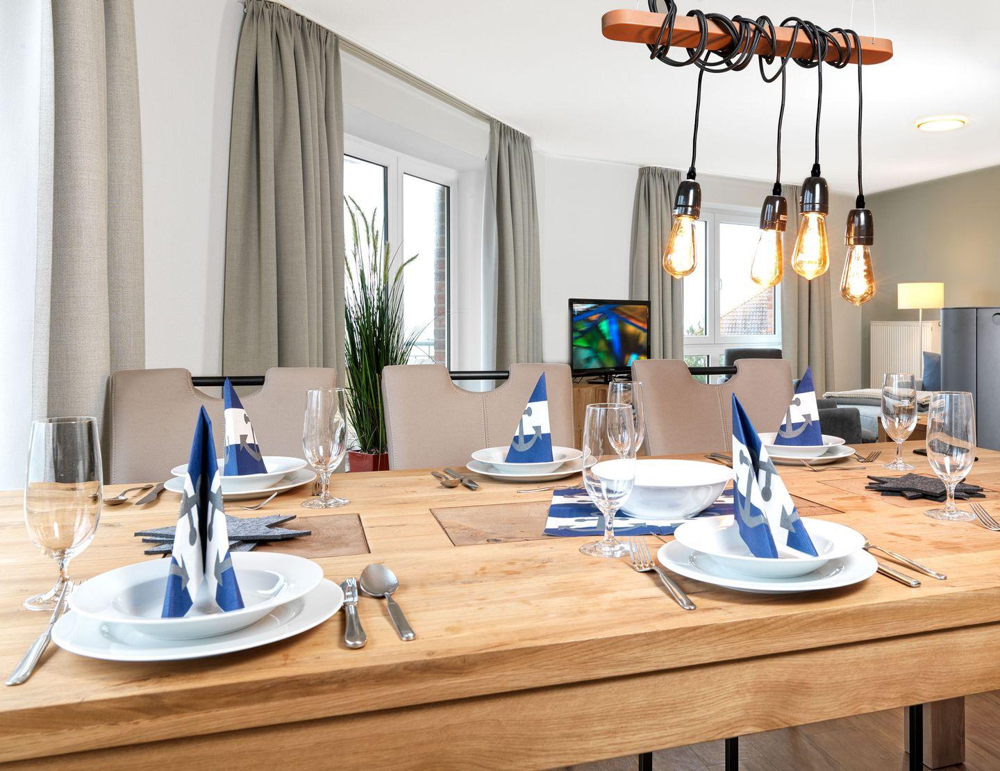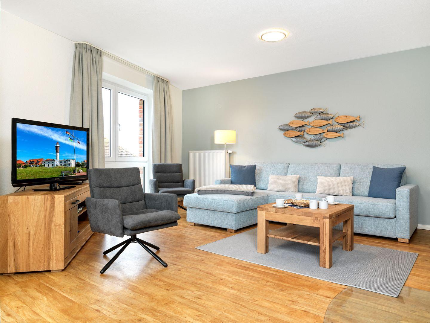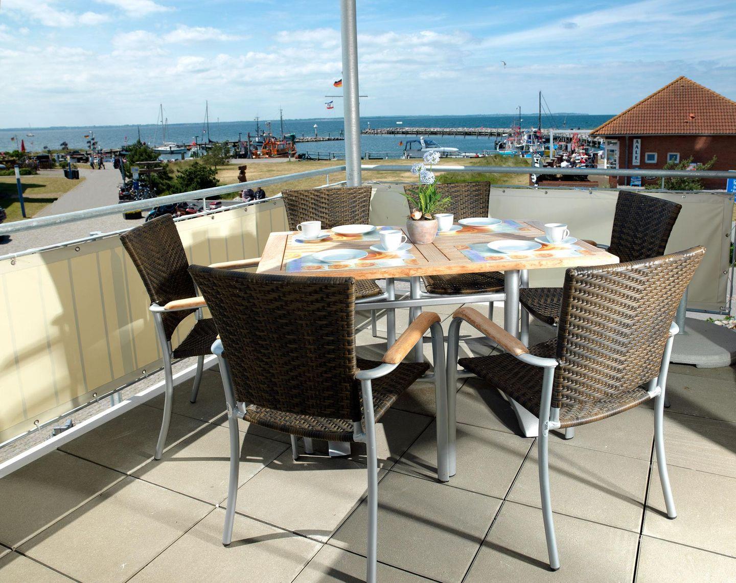 Ein großes Wohnzimmer mit offener Küche, Kaminofen, Schlafcouch sowie einem Balkon, der zum Hafen ausgerichtet ist erwarten Sie!