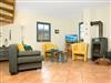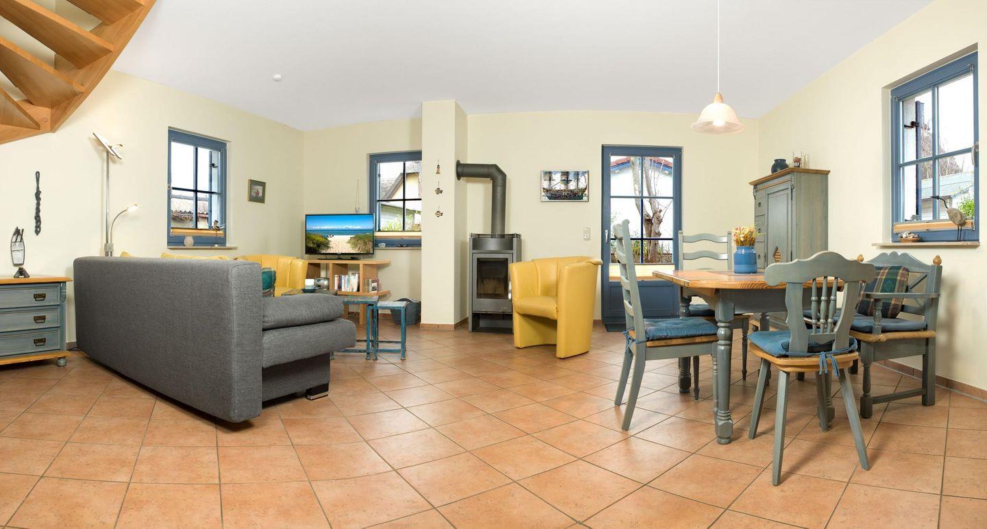 Genießen Sie einen Traumurlaub unter Reet: das große, helle und gemütliche Wohnzimmer mit LCD-TV, Kaminofen und offener Küche lässt keine Wünsche offen.