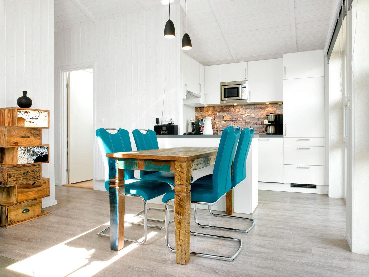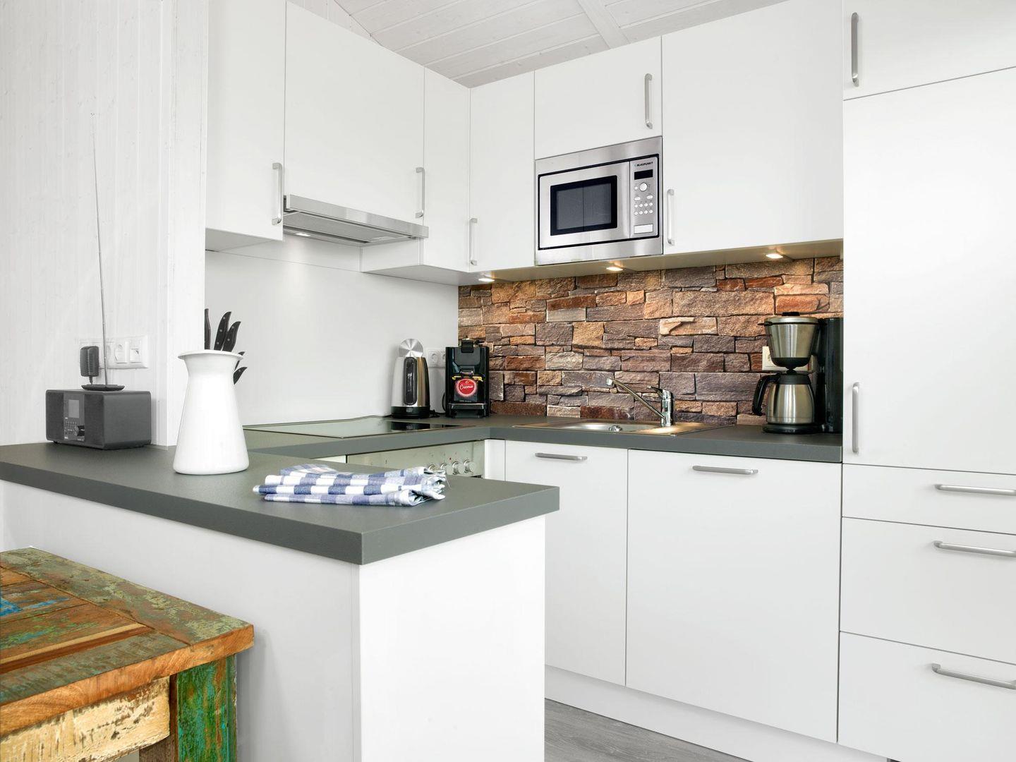 Das Wohnzimmer verfügt über große Fenster und ist modern und hell ausgestattet. Genießen Sie kuschelige Stunden vor dem Kaminofen mit Blick in die Natur. Die offene Küche ist komplett und perfekt ausgestattet. Vom Wohnzimmer gelangt man auf die Terrasse und von dort auf die sich anschließende große Wiese.