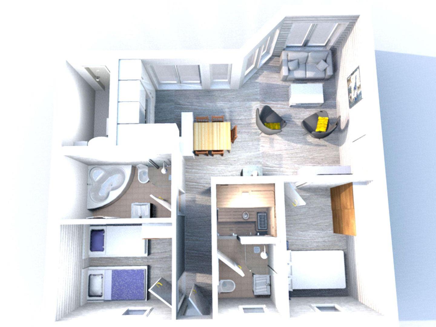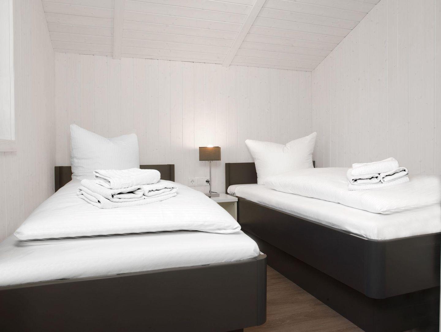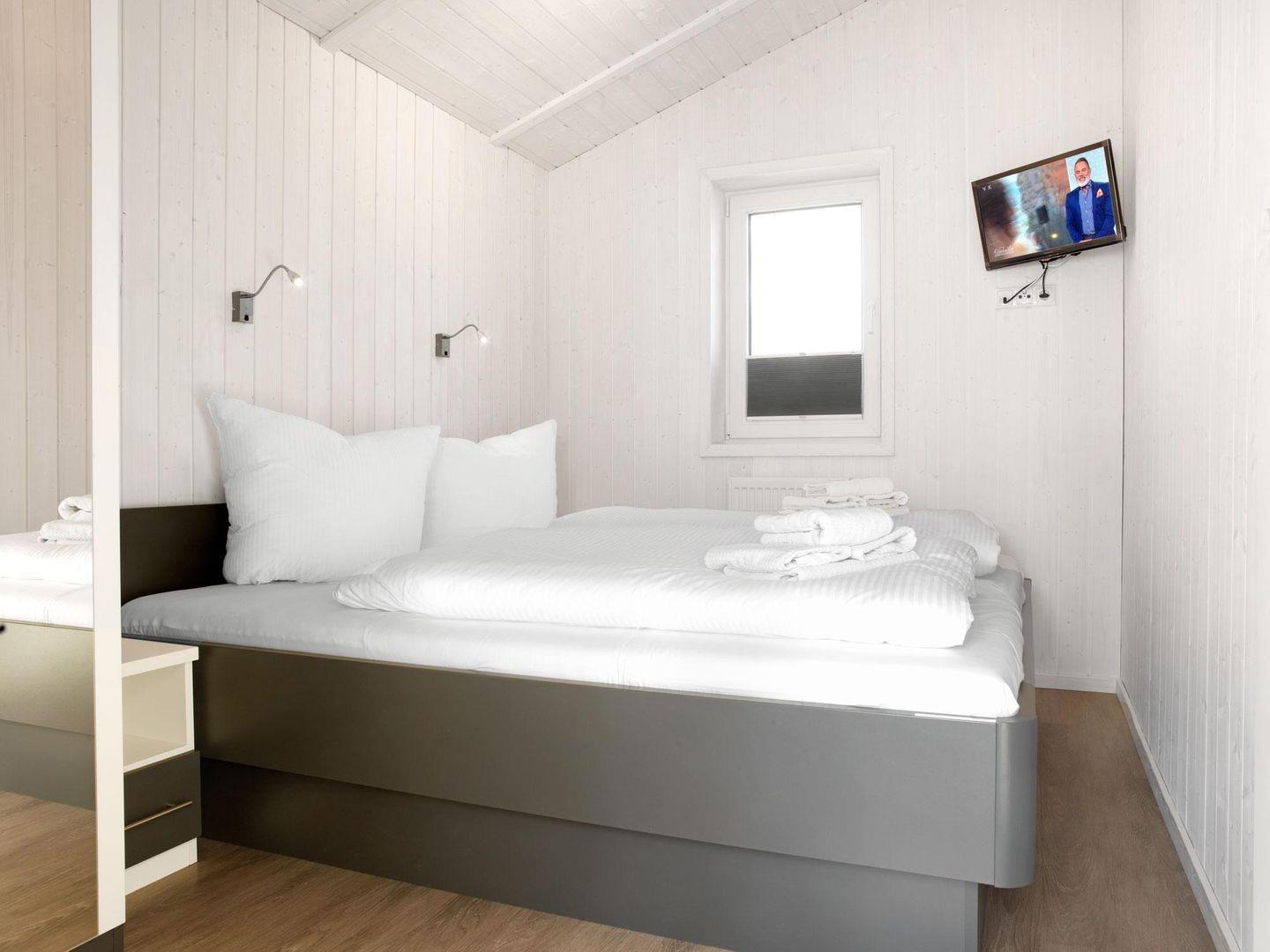 Zwei Schlafzimmer, eines mit Doppelbett sowie TV und das andere mit zwei Einzelbetten ergänzen das Haus. Eine Schlafcouch befindet sich im Wohnzimmer.