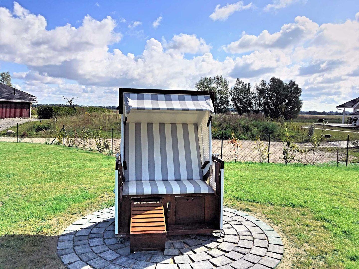 Hier bietet sich viel Platz zum Spielen und zum Erholen. Ein Strandkorb und Gartenmöbel sind selbstverständlich vorhanden ebenso wie ein Grill.
