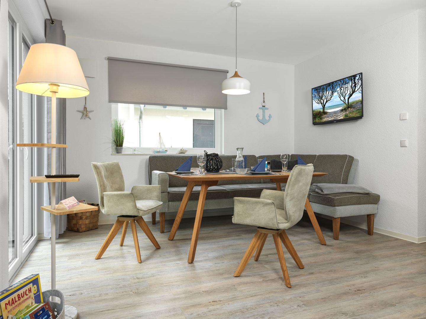 Das Haus besticht durch ein offenes Wohnkonzept, ein Wohnbereich mit einem großem Fernseher und gemütlicher Eckbank/Sitzgruppe sowie offener Küche mit direktem Zugang zur Terrasse. Die Küche ist mit modernen Geräten wie Herd, Backofen, Geschirrspüler und Kühlschrank ausgestattet – hier wird das Kochen zum Vergnügen!