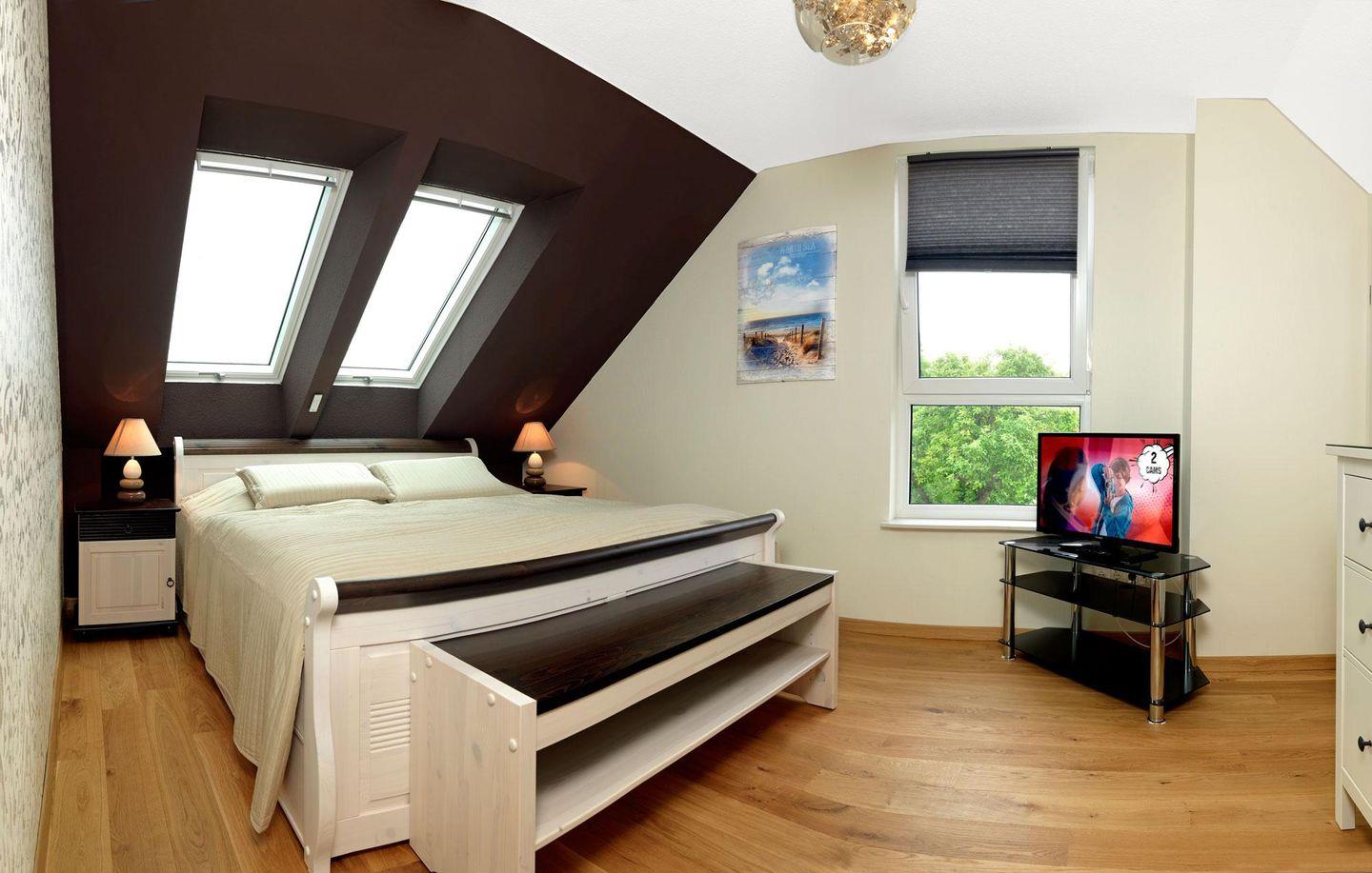 Im Erdgeschoss erwartet Sie das großzügige Wohnzimmer mit offener, sehr gut ausgestatteter Küche sowie ein Schlafzimmer mit Doppelbett. Das Wohnzimmer, mit dem freien Blick ins Grüne, bietet Ihnen viel Unterhaltung mit Flach-Maxi-TV, DVD,CD sowie MP3 Player. An kalten Tagen sorgt der Kaminofen für heimelige Wärme. Außerdem befindet sich ein Bad mit Dusche und WC im EG sowie ein Schlafzimmer mit Doppelbett. Bei jedem Wetter können Sie die Infrarot Kabine (3 Personen) oder im Garten die Fasssauna (4 Personen) und die Außendusche (nur bei frostfreien Temperaturen) genießen. Im Obergeschoß befinden sich 2 weitere Schlafzimmer, eins mit Doppelbett und eins mit 2 Einzelbetten. Ein weiteres Bad mit Dusche, Badewanne und WC erwartet Sie ebenfalls im OG. Die Badewanne steht direkt vor einem großen Fenster und bietet Ihnen einen großartigen Fernblick über die Felder bis zum Wasser.