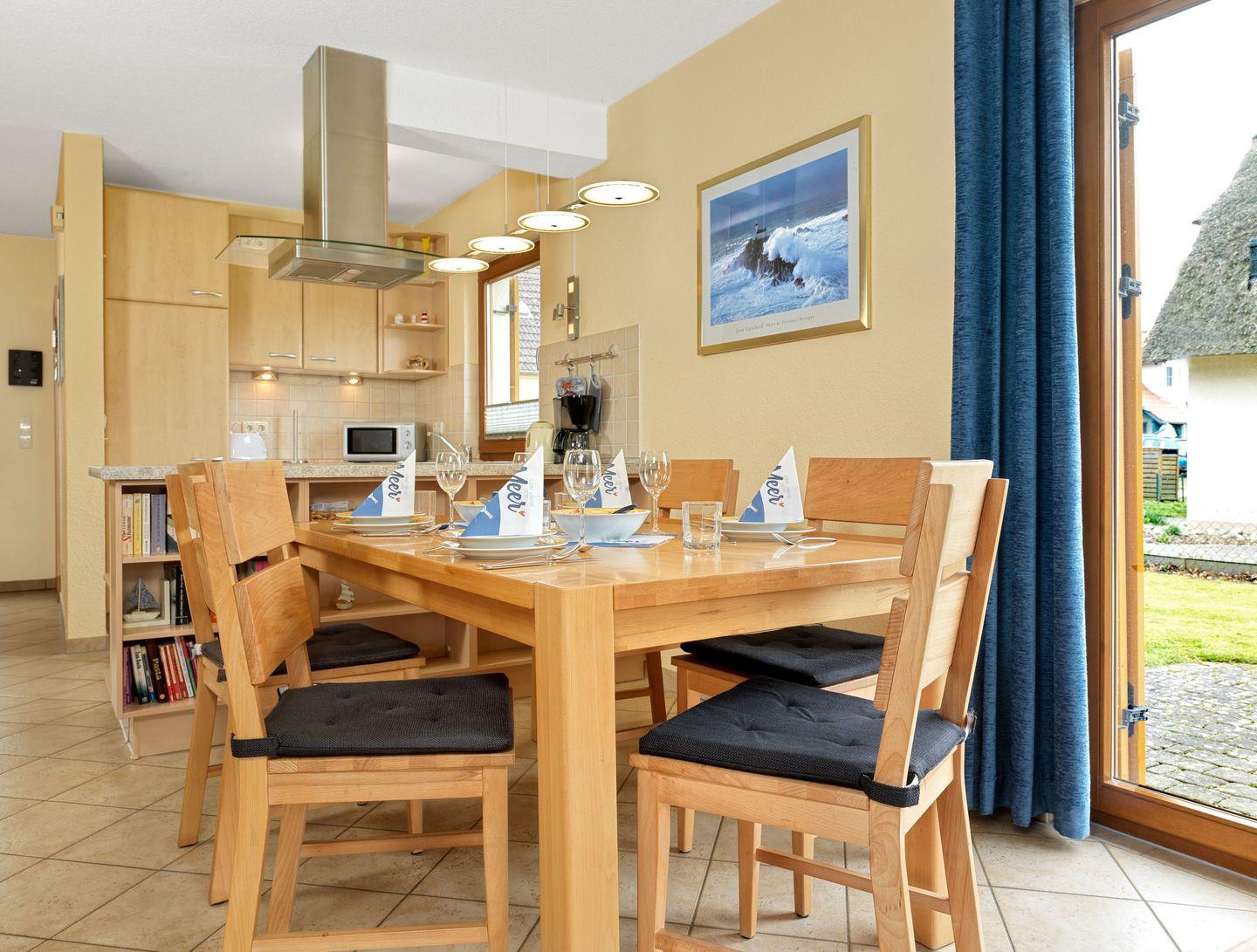 Beim Betreten des Ferienhauses empfängt Sie ein großzügiger und heller Wohn- und Essbereich mit integrierter Küche. Ausgestattet mit einem LCD-TV-Gerät, zwei bequemen Sofas und dem Kamin erleben Sie hier gemütliche Stunden - vielleicht mit einem spannenden Buch aus der vorhandenen Bücherecke. Sollte es Sie in die große weite Welt ziehen, steht Ihnen im Haus und im Garten kostenlos WLAN zu Verfügung.