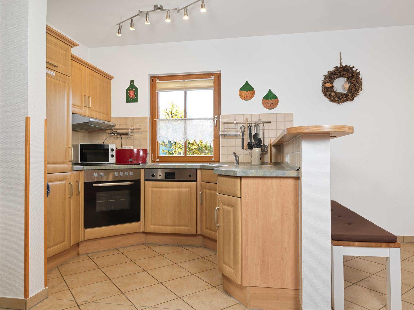 Die offene, voll ausgestattete Küche ist harmonisch in den Wohnbereich integriert und lädt dazu ein, gemeinsam zu kochen und zu genießen. Ceranherd, Backofen, Mikrowelle, Spülmaschine, Kühlschrank und ein zusätzlicher Gefrierschrank stehen Ihnen zur Verfügung. Am großen Esstisch im Essbereich findet die ganze Familie Platz.