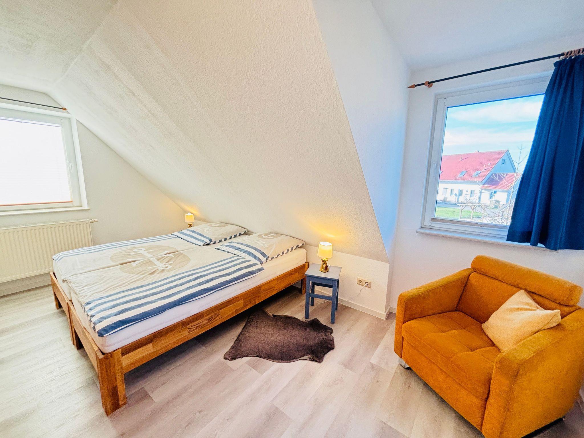 Die 3-Raum Ferienhaushälfte verfügt über ein Wohnzimmer mit TV, Radio, Sofa, Sessel und Couchtisch. Die offene und helle Küche mit Kühlschrank, Ceranfeld, Backofen, Kaffeemaschine, Toaster und Wasserkocher bietet Ihnen alle erforderlichen Annehmlichkeiten.