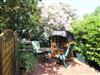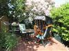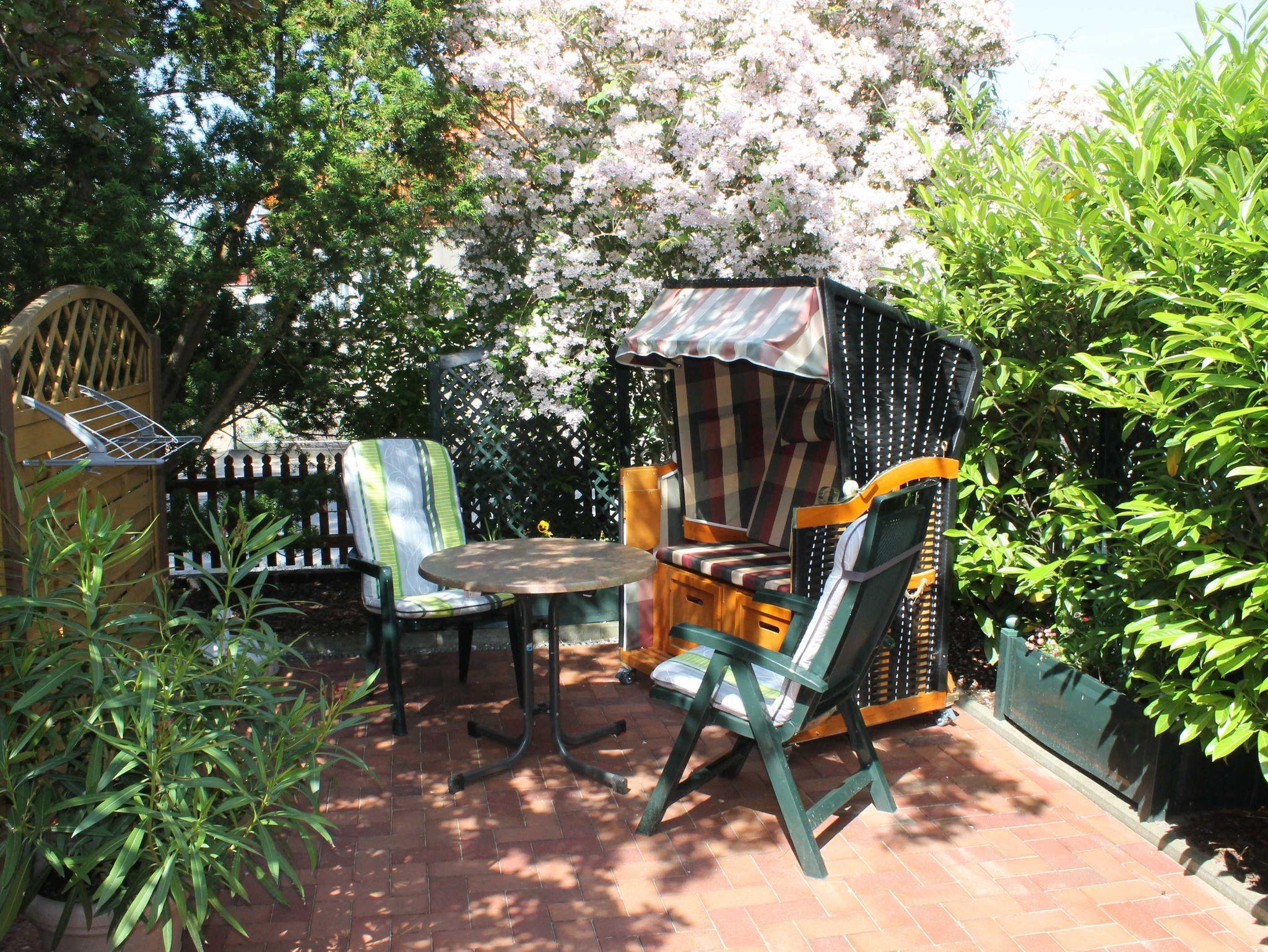 Im Garten befindet sich eine Sitzecke mit Strandkorb.