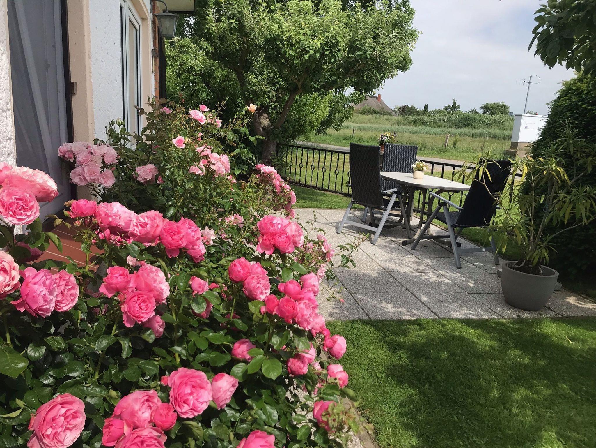 Direkt vor dem Haus ist die Terrasse. Rechts sind auch die Salzwiesen und das Boddengewässer zu erkennen.