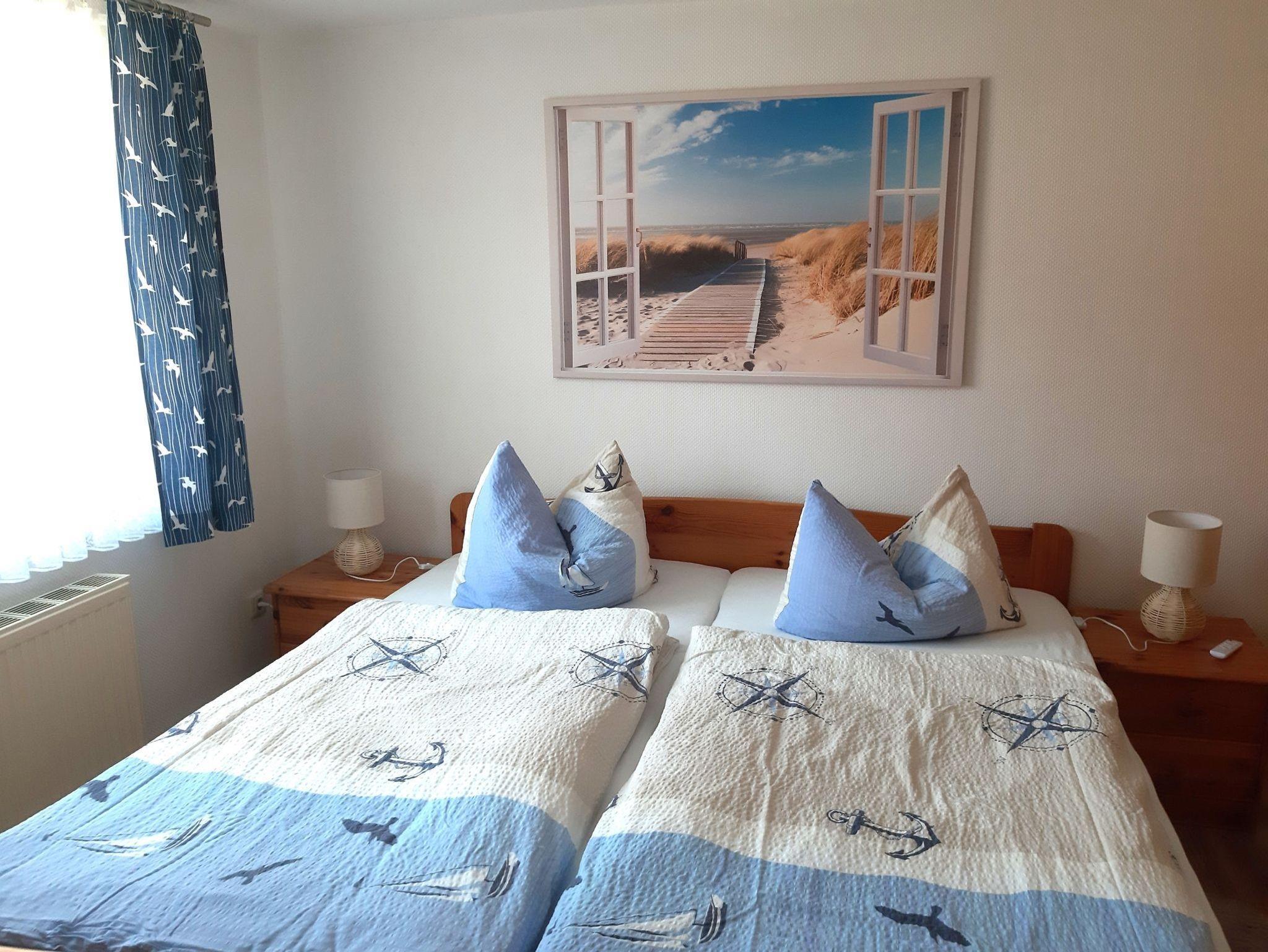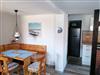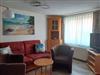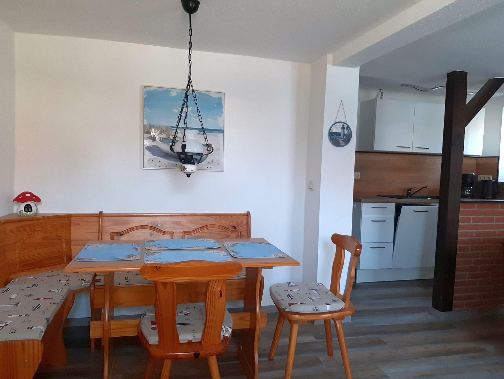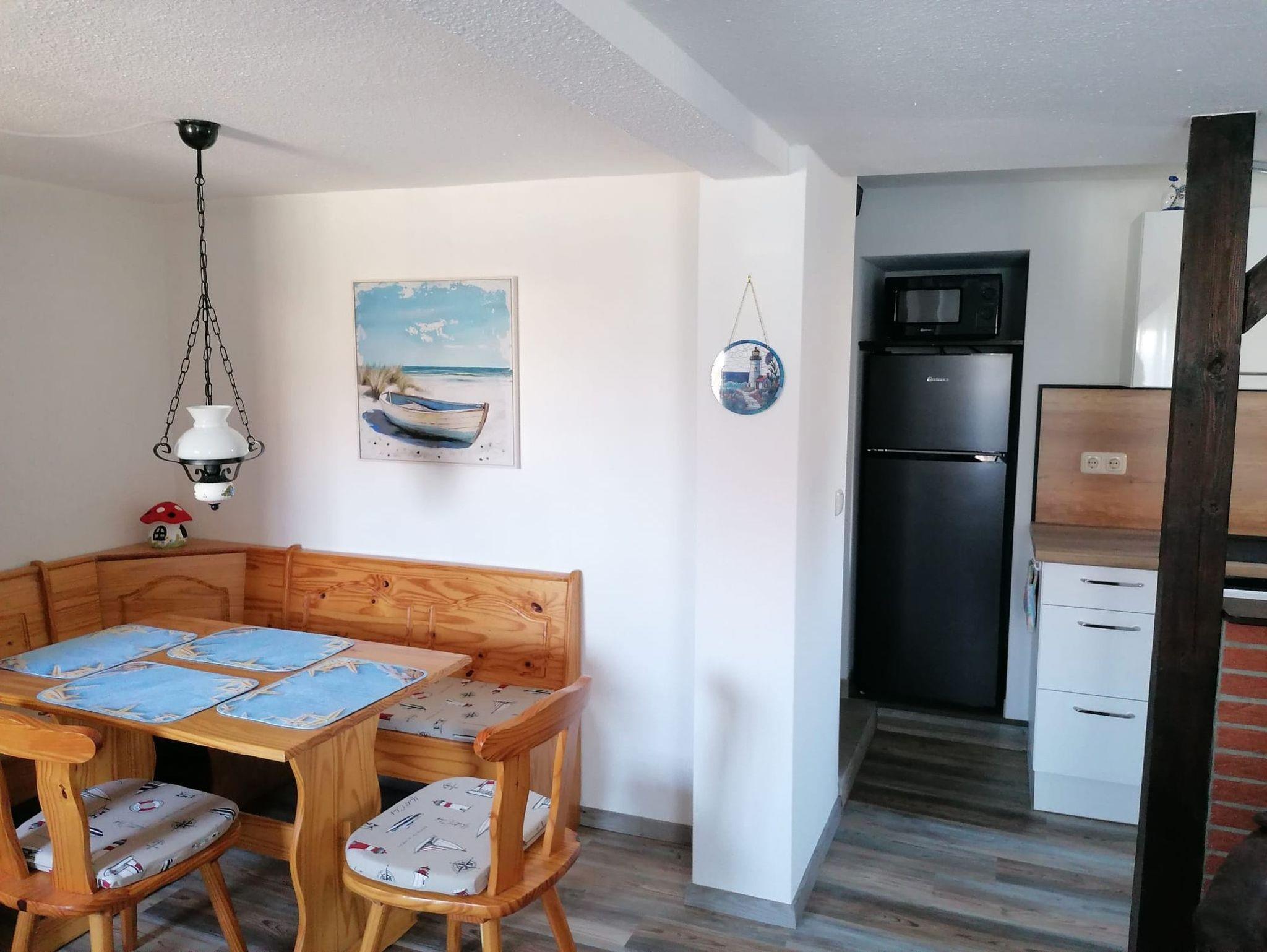 Diese Ferienwohnung verfügt über einen Wohn- und Küchenbereich, mit gemütlichem Funktionssofa (Liegefläche 160 x 200 cm), Couchtisch sowie zwei Sesseln, SAT-TV und separatem Esstisch für bis zu 4 Personen. Die Küche ist mit einem 2er Ceranfeld sowie einer Kühl- und Gefrierkombination und Spülmaschine ausgestattet. Vorhanden sind Kaffeemaschine, Toaster und Wasserkocher sowie Geschirr, Töpfe, Besteck usw. Im Hauswirtschaftsraum steht Ihnen ein Waschtrockner zur Verfügung.