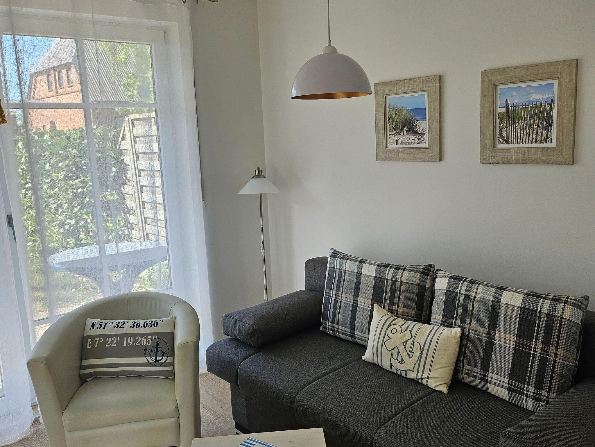 Das behagliche Wohnzimmer ist ausgestattet mit einem Flachbild-SAT-TV, Radio, einer komfortablen Couch sowie einem Sessel. Von hier aus gelangen Sie direkt auf die sonnige Südterrasse, die gemeinsam mit dem angrenzenden Garten zu entspannten Stunden im Freien einlädt. Natürlich stehen Ihnen Terrassenmöbel inklusive Tisch zur Verfügung.