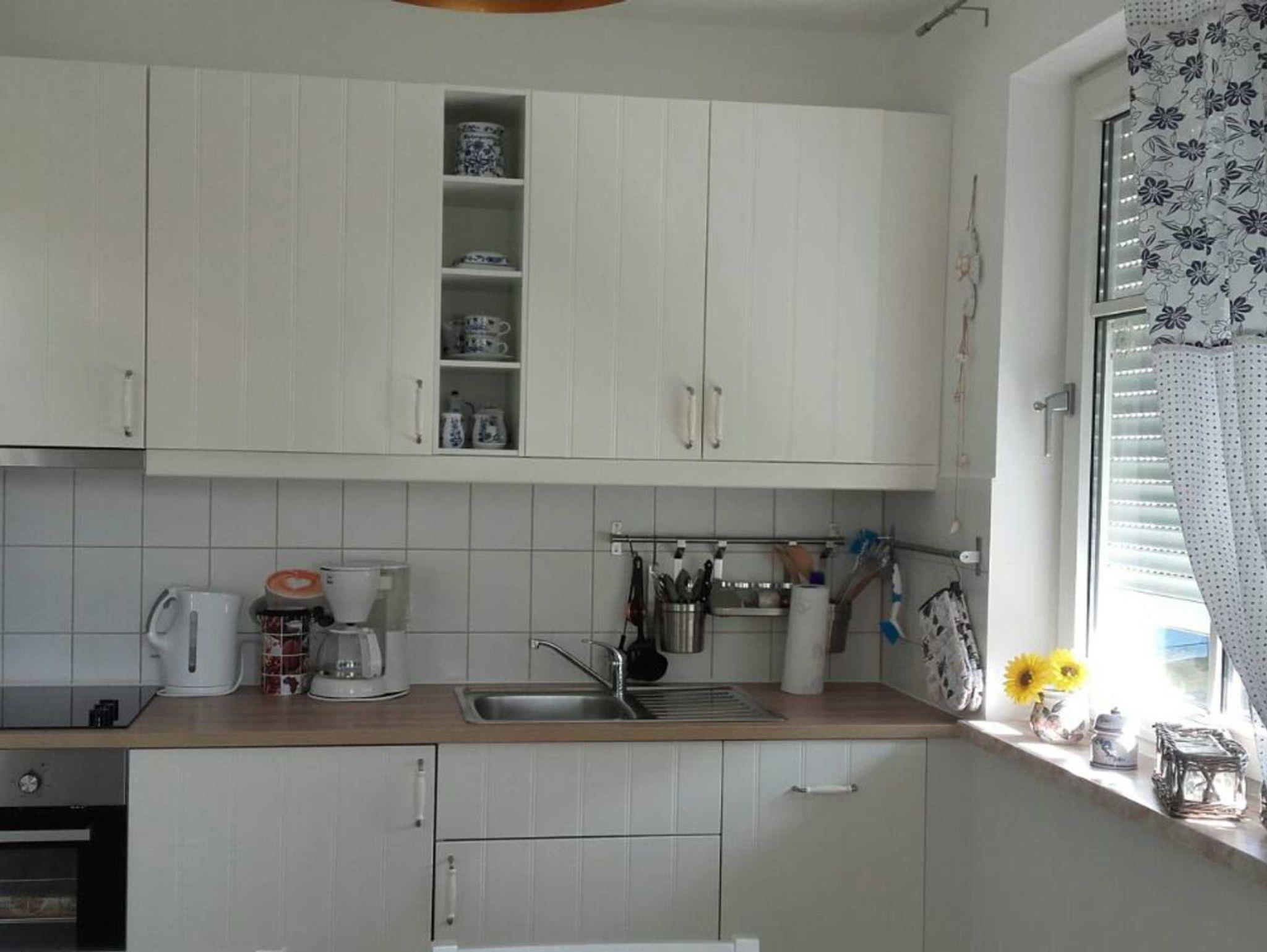 Die hochwertige Einbauküche lässt keine Wünsche offen: Herd, Backofen, Geschirrspüler, Filterkaffeemaschine, Wasserkocher, Toaster und vieles mehr stehen Ihnen zur Verfügung. Ein gemütlicher Essbereich mit vier Stühlen lädt zum Verweilen ein.