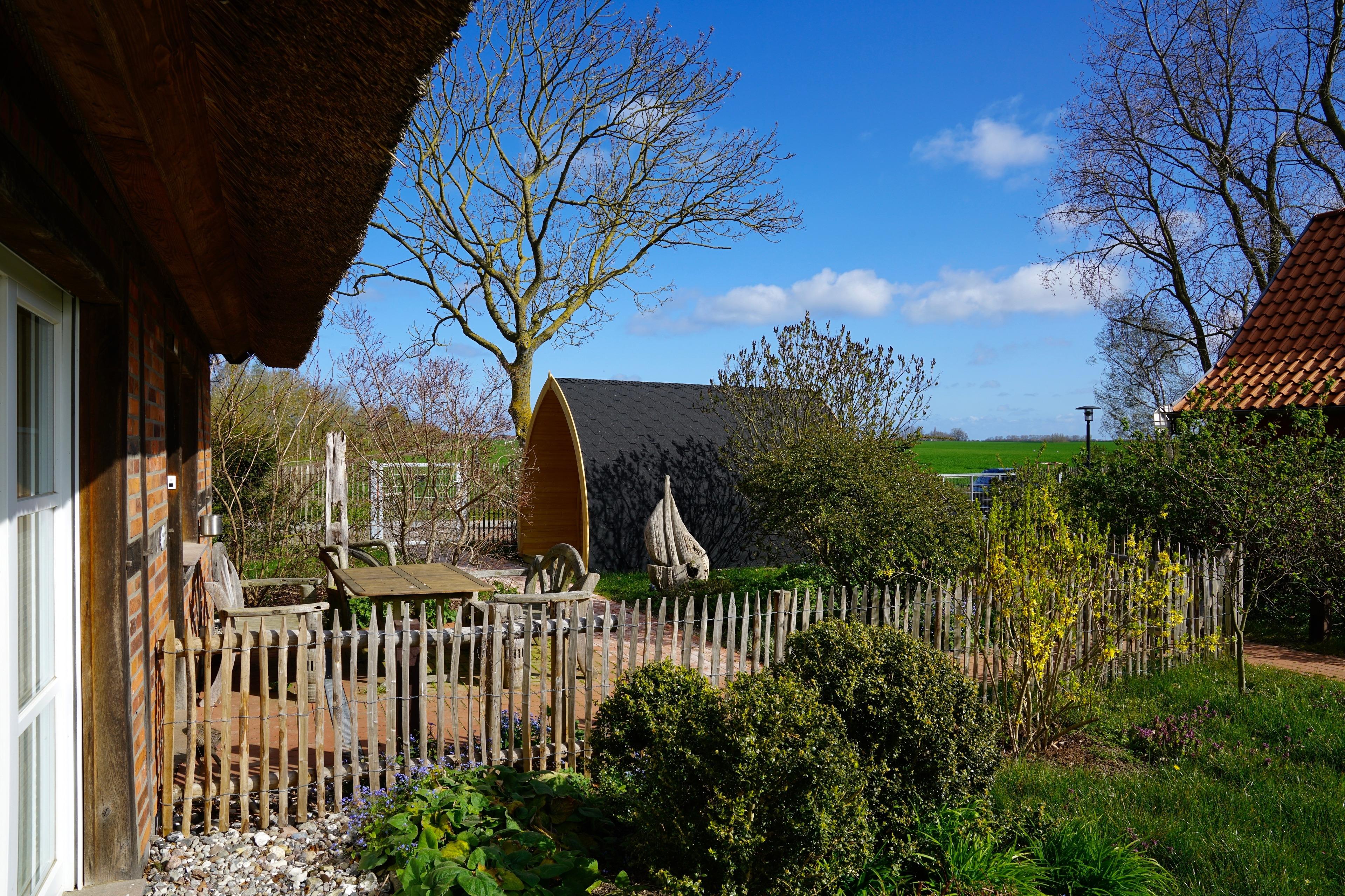 Das Haus verfügt über eine Ost- und eine Westterrasse, wobei die Westterrasse mit einem separaten Gartenbereich von etwa 300 m² durch einen Zaun und Hecken abgetrennt ist. Hier stehen Ihnen zwei Strandkörbe und Liegen zur eigenen Verfügung.
