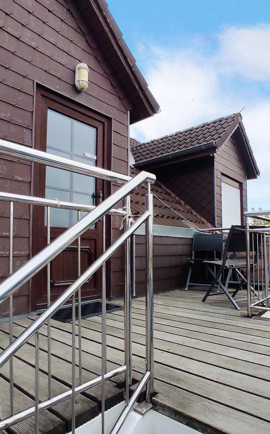 Der kleine Balkon mit Balkonmöbeln und einem Sonnenschirm lädt dazu ein, die frische Meeresluft zu genießen und den Tag im Freien ausklingen zu lassen.
