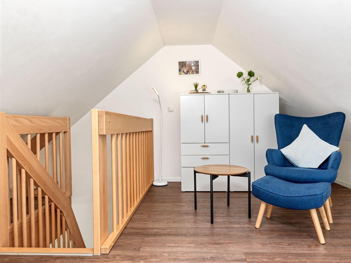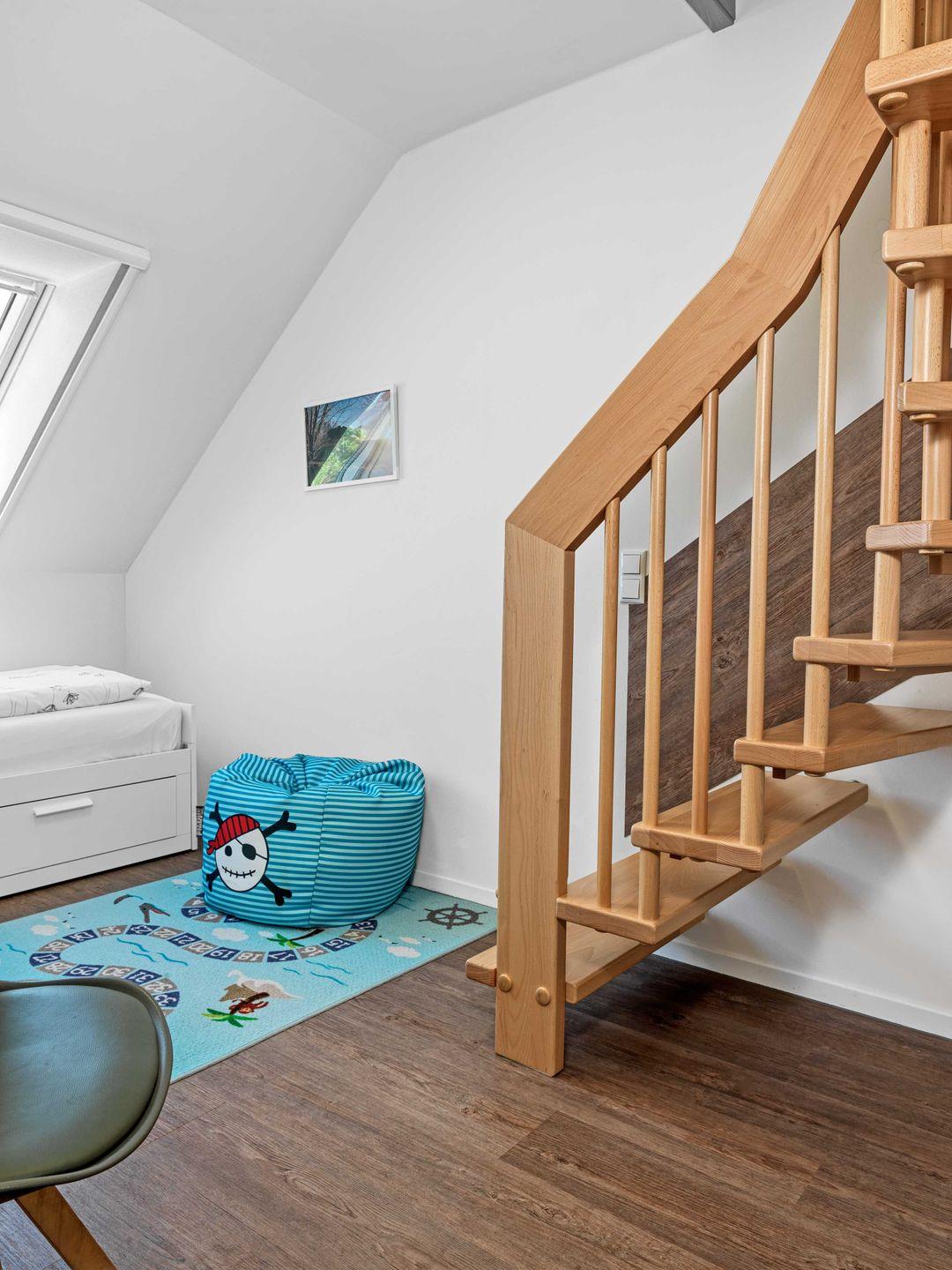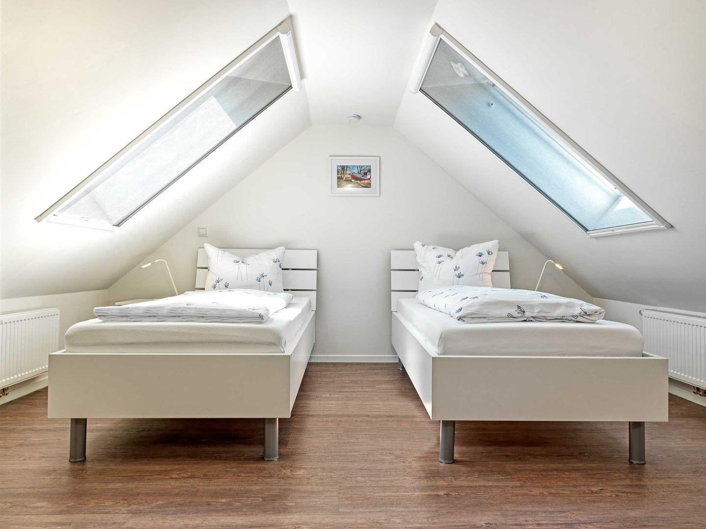 Die beiden Schlafzimmer eines mit Doppelbett und eines mit einem Einzelbett, sowie ein weiteres Schlafzimmer mit zwei Einzelbetten im Dachgeschoss bieten bis zu 5 Personen Platz für eine entspannte Nachtruhe.