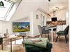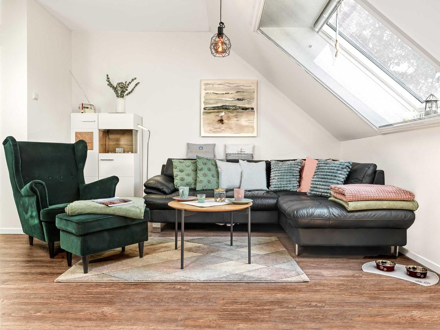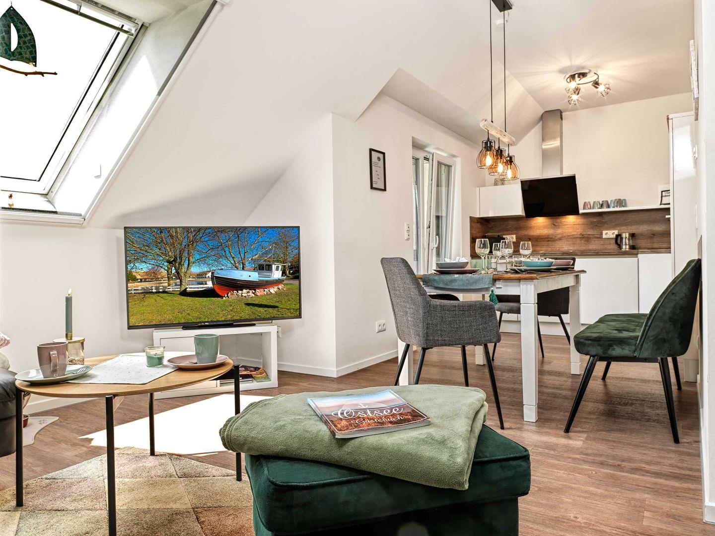 Das helle, freundliche Wohnzimmer mit offener Küche, Ess- und Wohnbereich verfügt über eine Sofaecke mit TV für einen gemütlichen Abend.