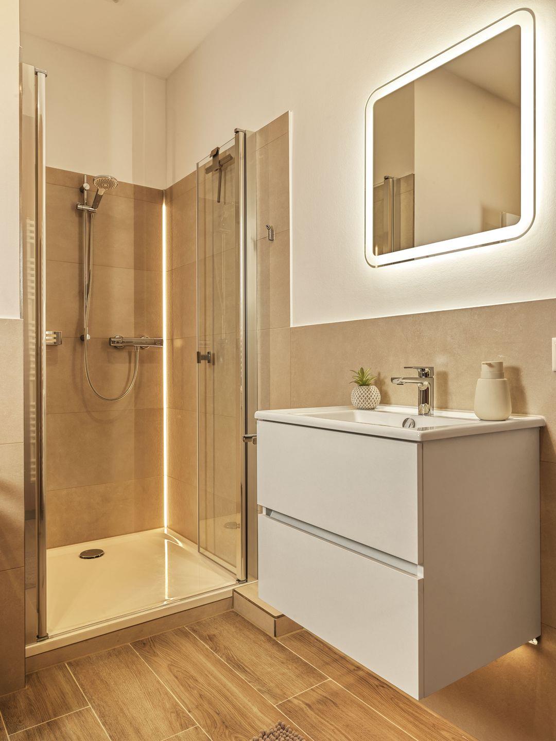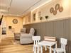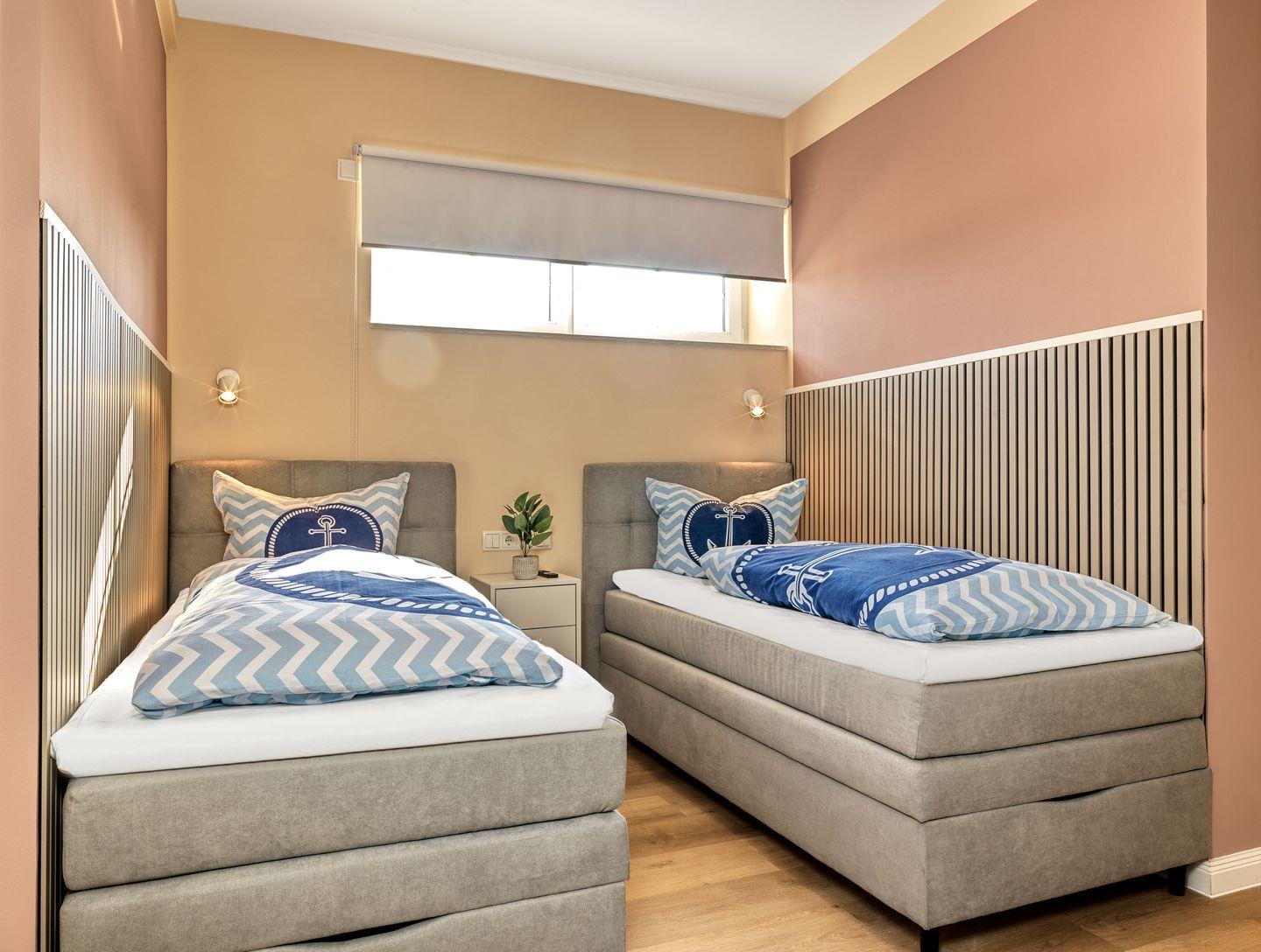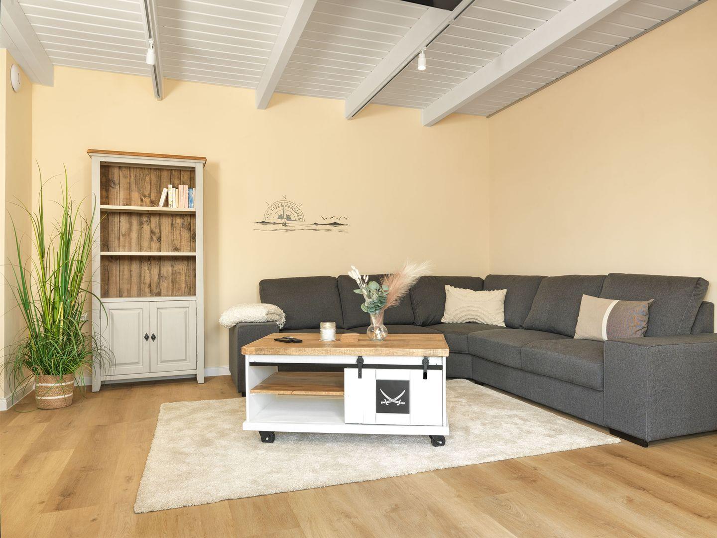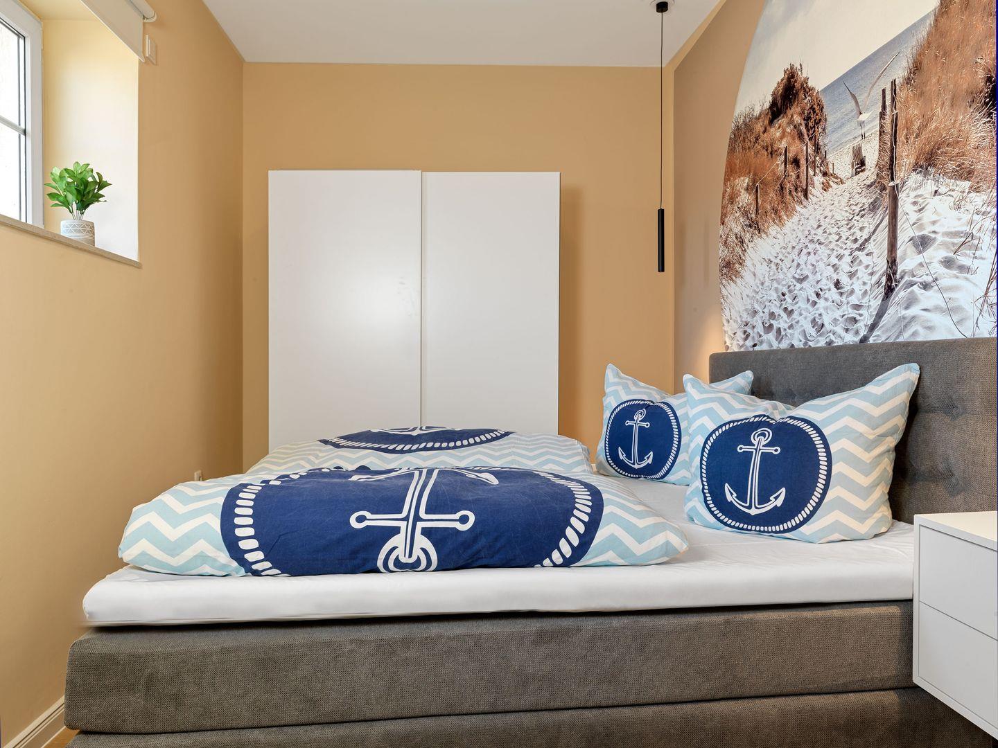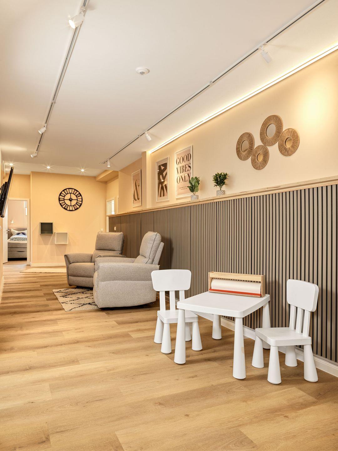 Die Ferienwohnung erstreckt sich über mehrere Zimmer und bietet Platz für bis zu acht Gäste, sodass sie optimal für größere Familien oder Gruppen geeignet ist. Mit vier gemütlichen Schlafzimmern mit Boxspringbetten und zwei modernen Badezimmern ist ausreichend Platz gewährleistet, damit sich jeder wohlfühlt. Das geräumige Wohnzimmer ist der ideale Ort, um den Abend bei einem Film zu genießen oder die Geselligkeit am Esstisch zu erleben. Die offene Küche, ausgestattet mit modernen Geräten, wie einer Spülmaschine und einem Backofen, lädt dazu ein die gemeinsamen Mahlzeiten zu genießen.