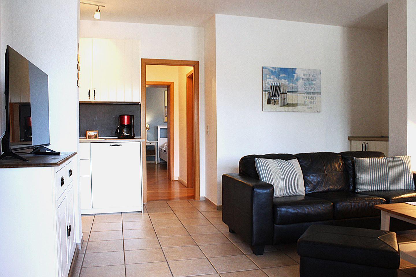 Der helle Wohn- und Essbereich ist kombiniert eingerichtet und bietet Ihnen eine gemütliche Sofaecke mit TV, kostenlosem WLAN und einem Esstisch. Die Küchenzeile ist ebenfalls offen zum Wohn- und Essbereich gestaltet und verfügt über viele technische Geräte, die eine entspannte Selbstversorgung ermöglichen.