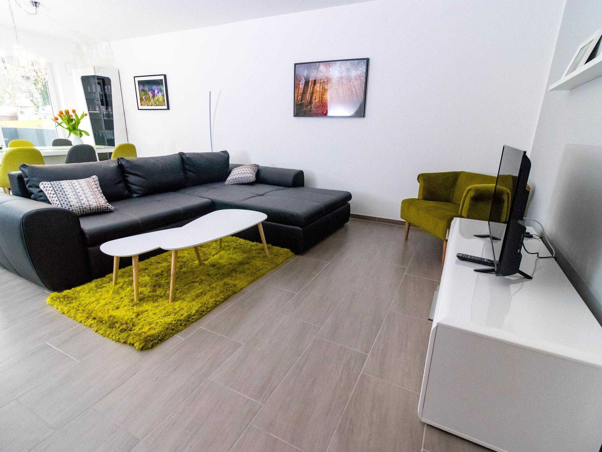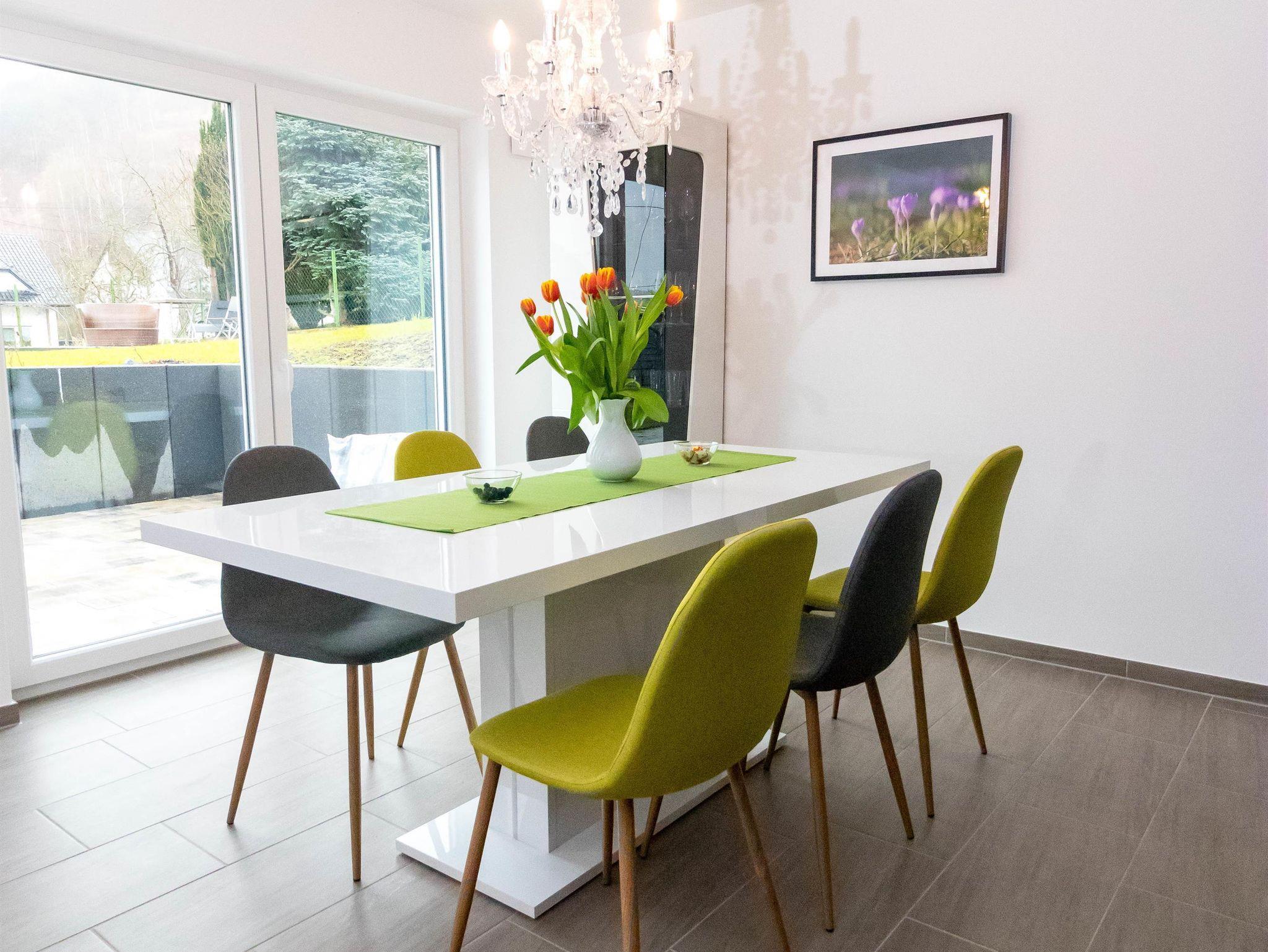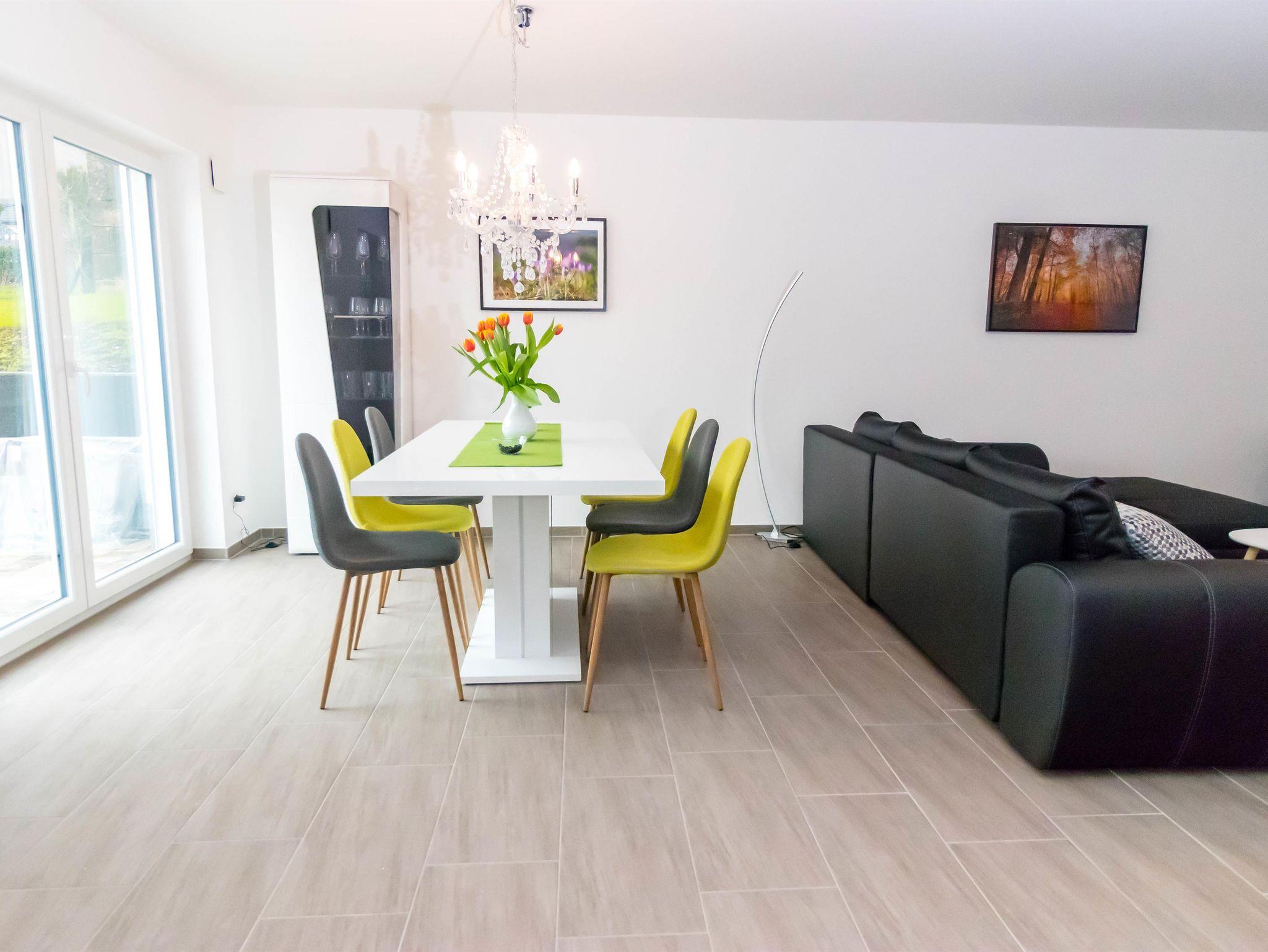 Unsere Ferienwohnung ist ein Neubau, errichtet nach den Effizienzvorgaben gemäß den KFW 70-Standards. Sie verfügt über eine Fußbodenheizung und ein dezentrales Belüftungssystem. Die insgesamt 80 Quadratmeter große Wohnung besteht aus einem großen Wohn- und Esszimmer, einer modernen Küche, zwei Schlafzimmern sowie einem Badezimmer. Alle Räume wurden mit viel Liebe zum Detail und für größtmöglichen Komfort für unsere Gäste eingerichtet. Vervollständigt wird das Angebot durch eine möblierte Gartenterrasse (inklusive Grill) und ein separater PKW-Stellplatz zur Ferienwohnung.