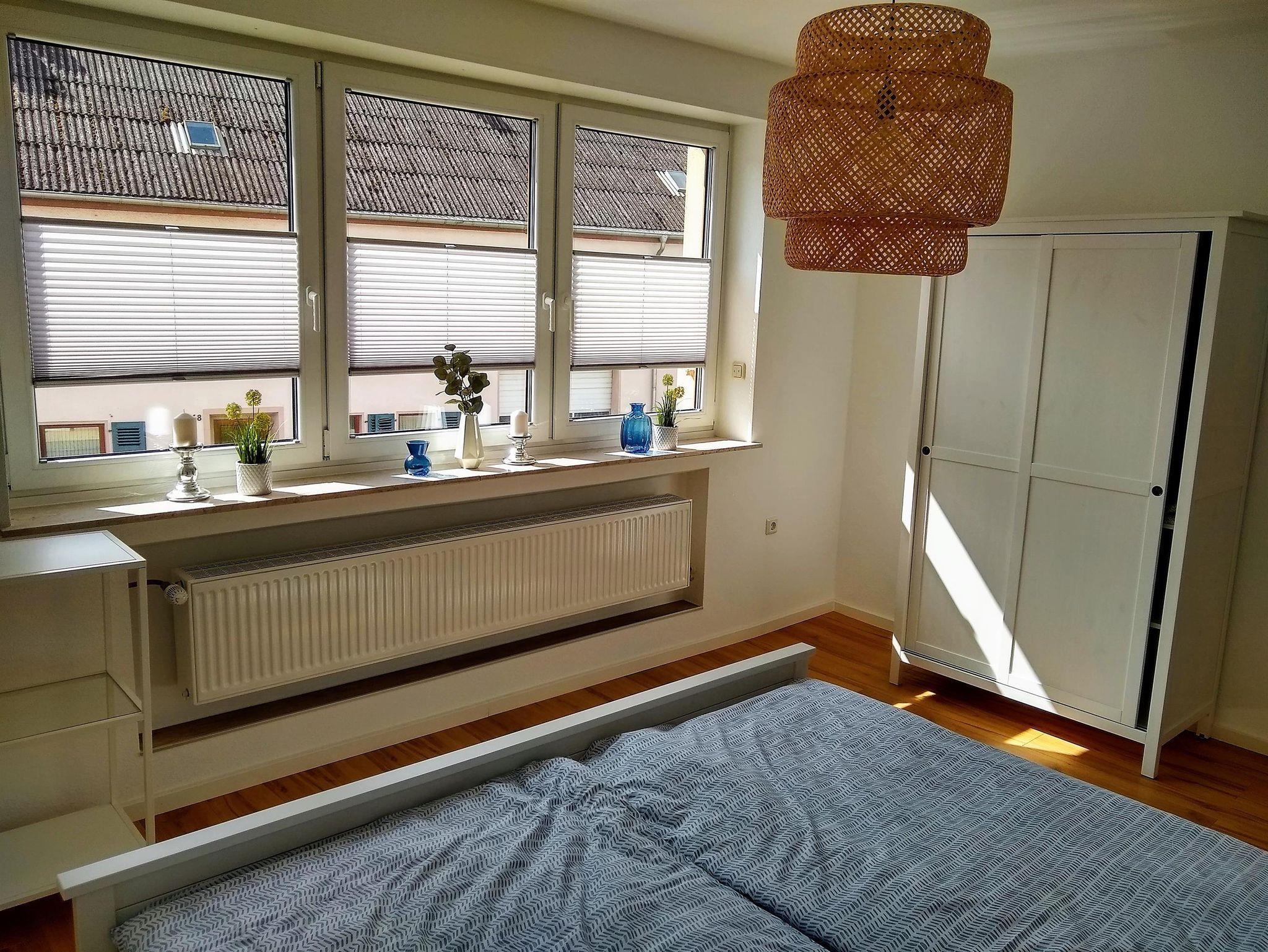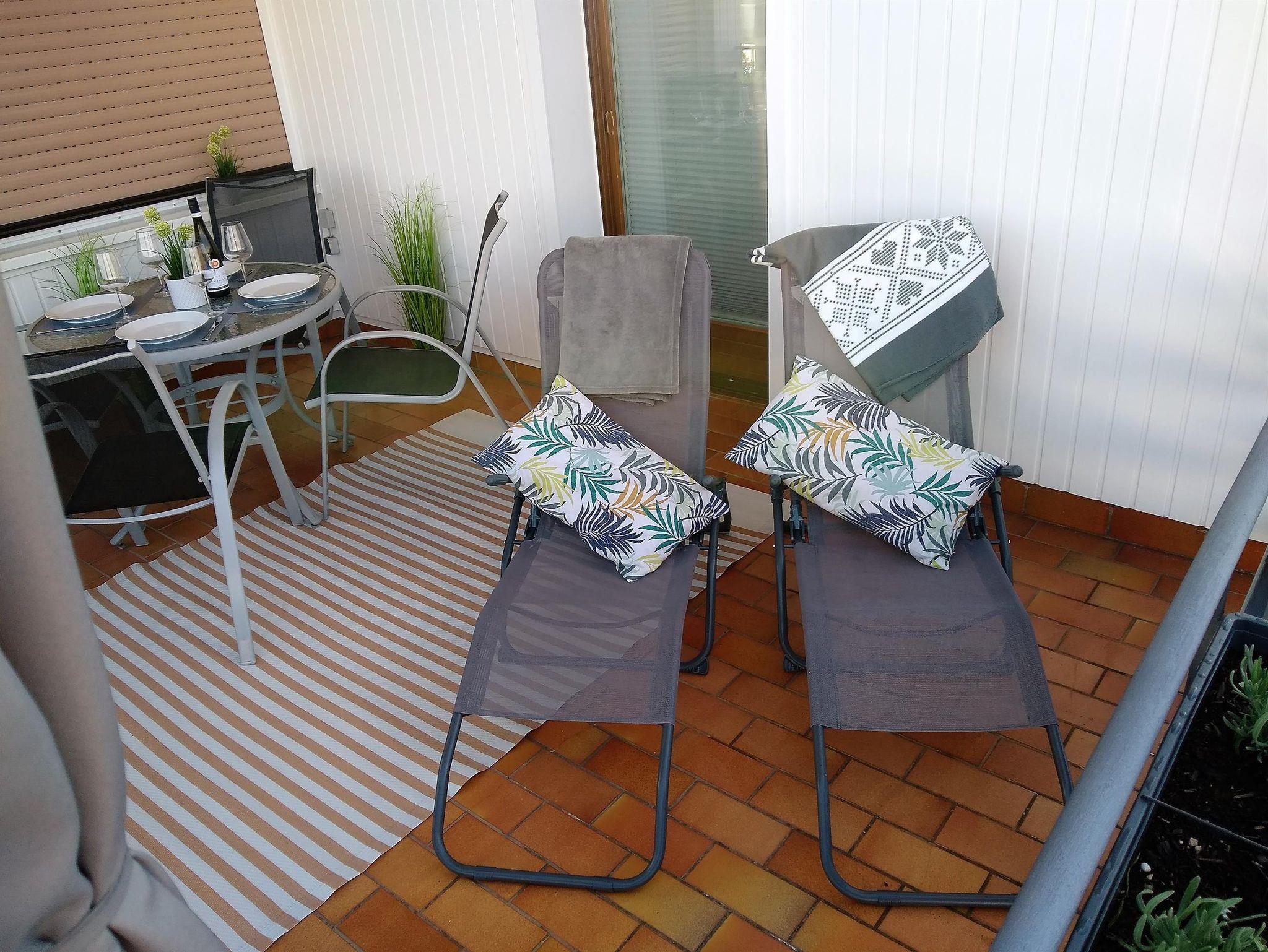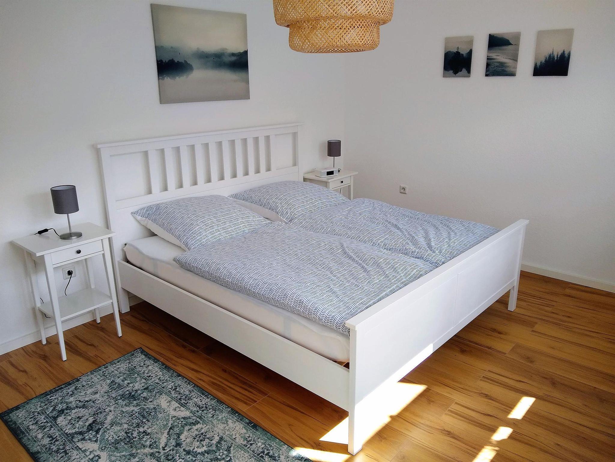 Gemütliche, moderne und komfortabel ausgestattete 63 qm-Ferienwohnung mit sep. Eingang. Die Wohnung befindet sich im 1. Obergeschoss. Großzügiges Wohn-Esszimmer mit SAT-TV und komplett ausgestatteter Küchenzeile, Geschirrspülmaschine und Essgruppe. 2 sep. Doppelschlafzimmer mit SAT-TV, Bad mit Dusche und WC. Abstellraum und großzügige Diele, halb überdachter Balkon mit Sitzgruppe und zwei Sonnenliegen mit Blick ins Grüne.