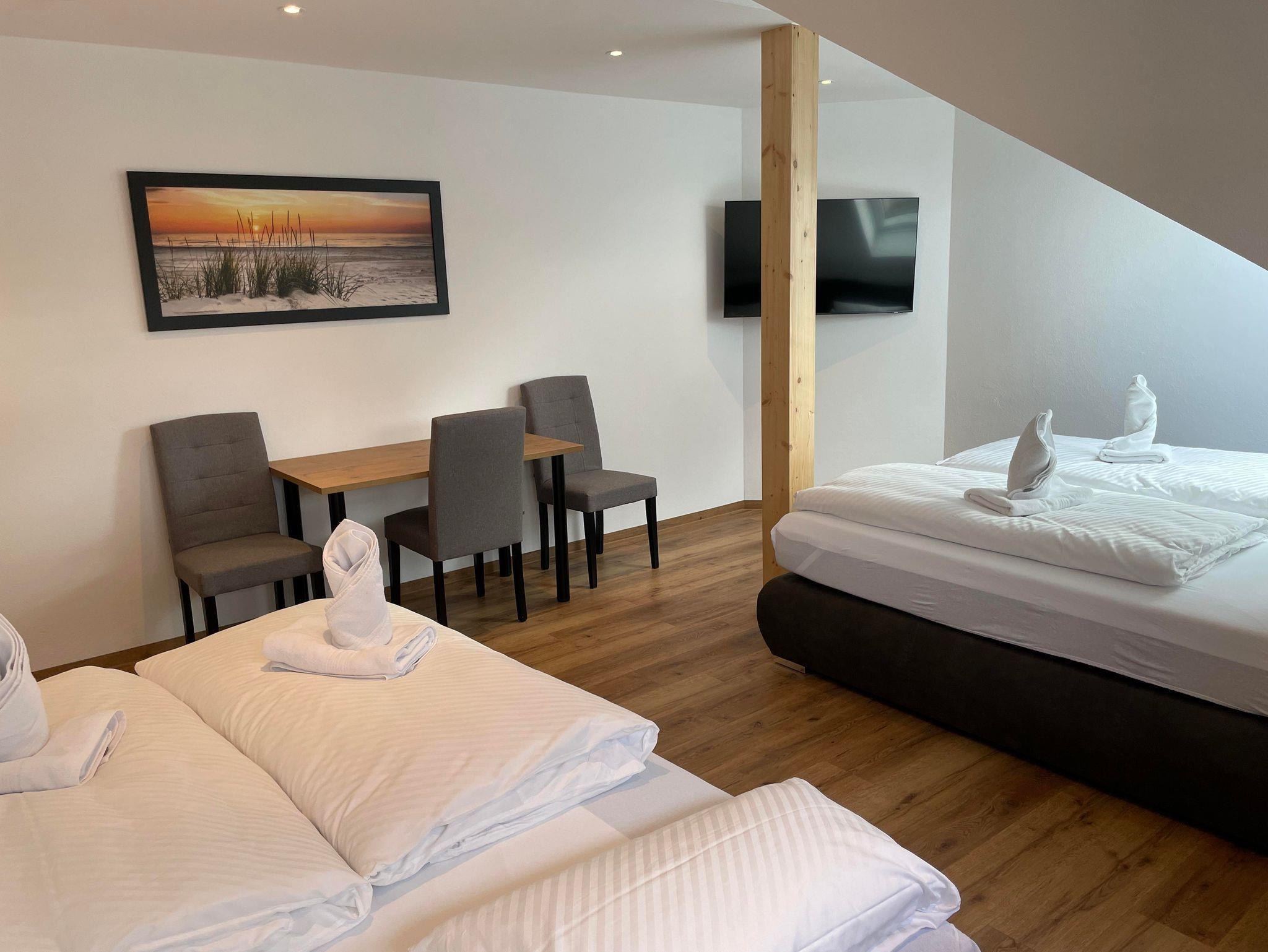 Modern und neu. Unser Superior Zimmer mit Boxspringbett, Schlafcouch, TV, Bad/WC mit begehbarer Dusche, Tisch, freies W-LAN