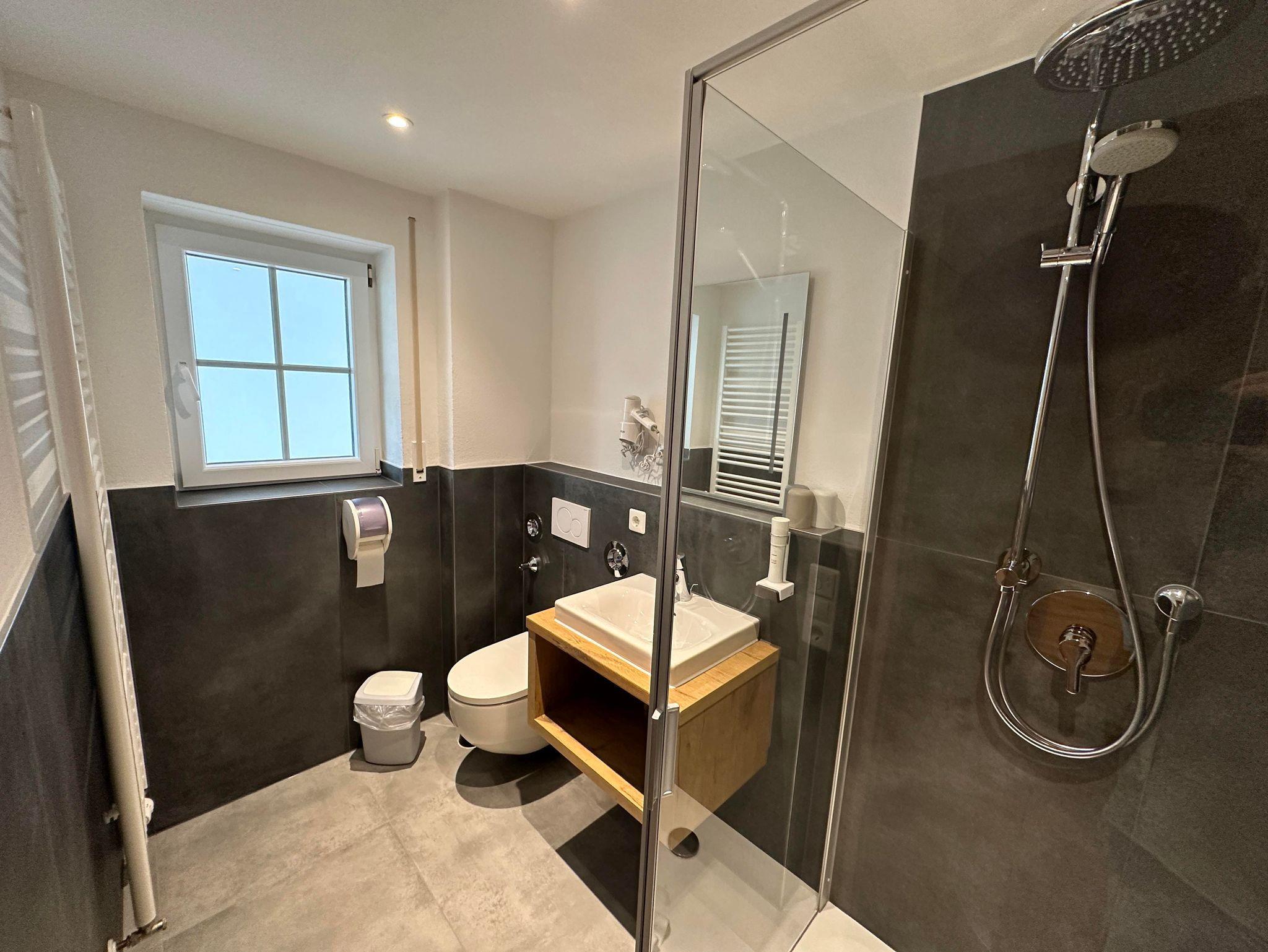 Ruhiges Doppelzimmer mit Dusche und WC, Radio, TV, Tisch, Erdgeschoss.