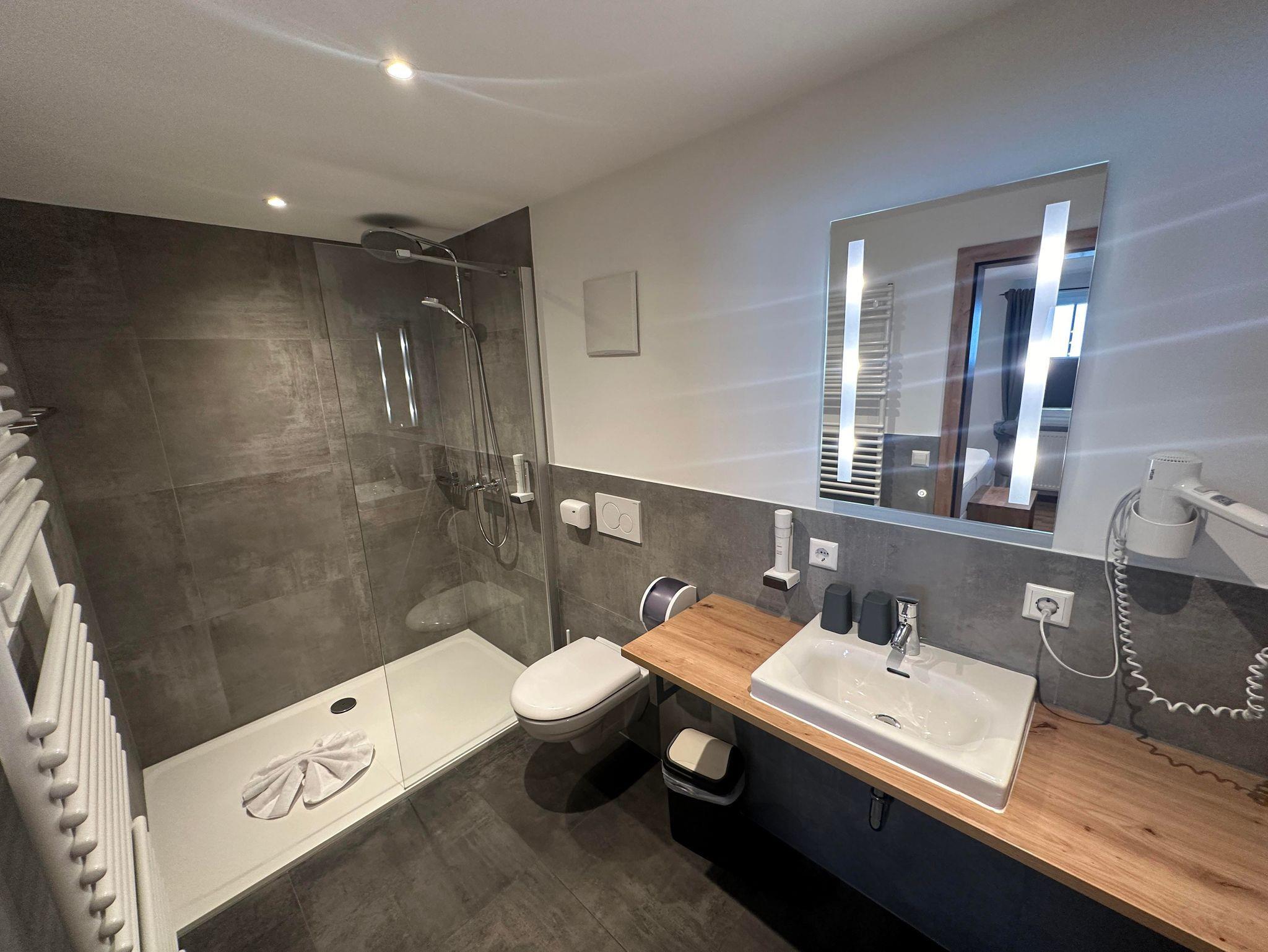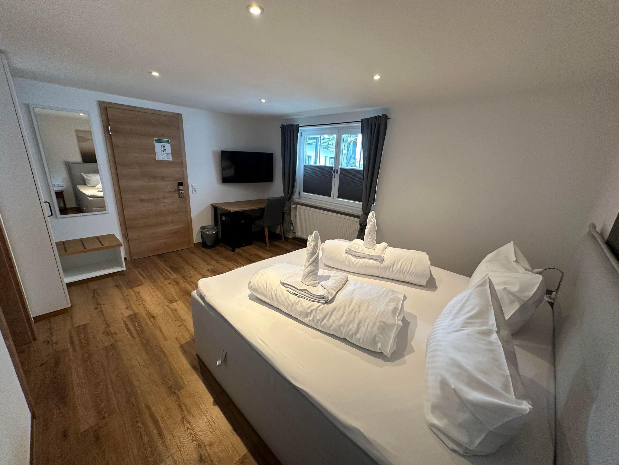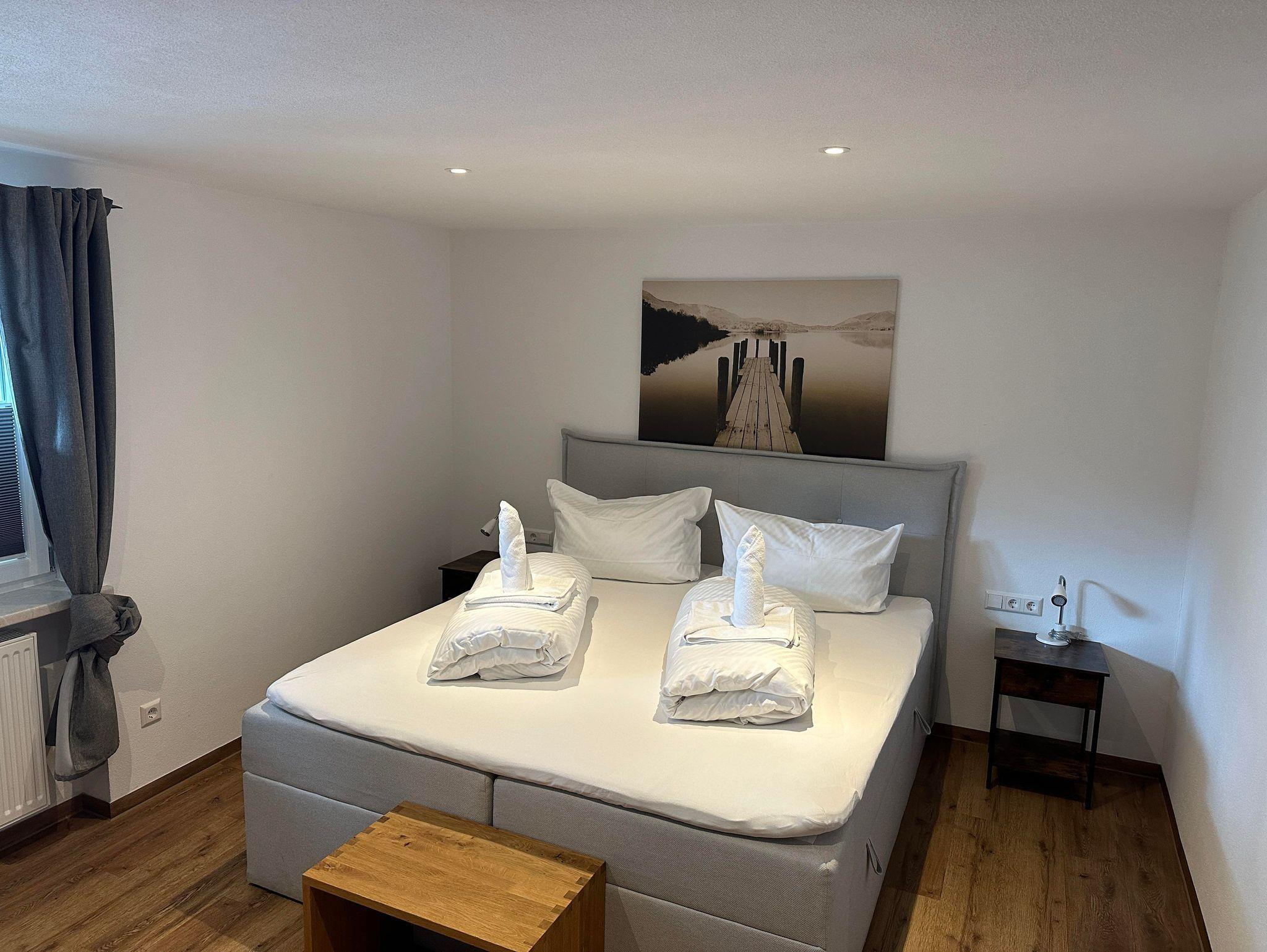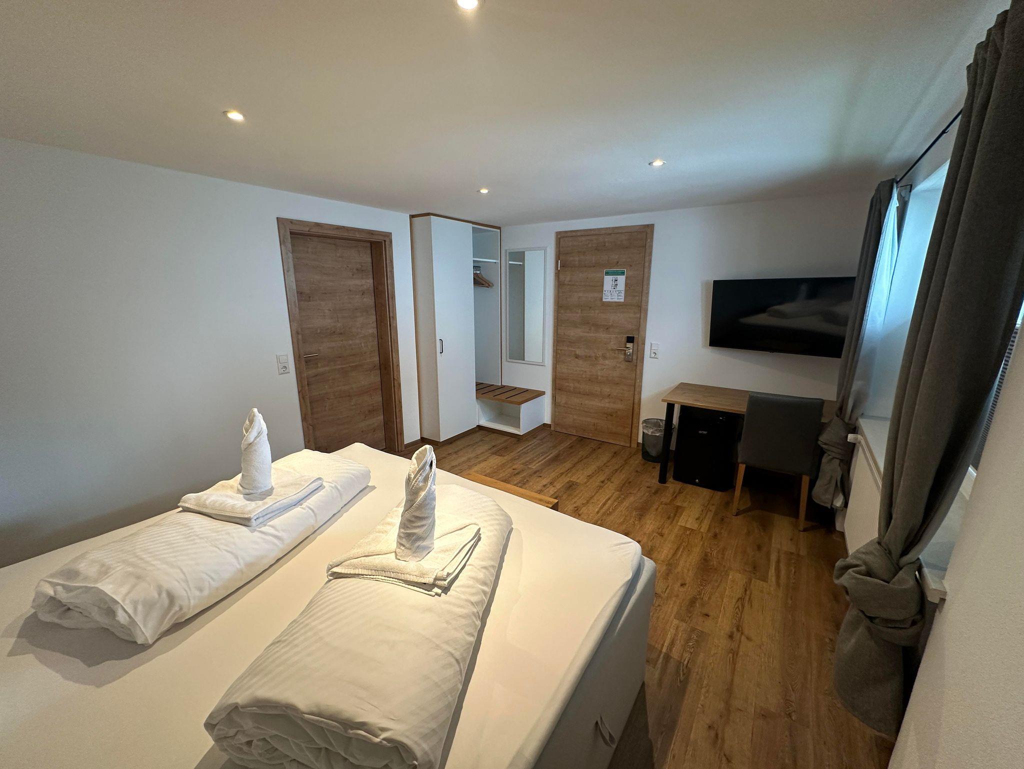 Ruhiges Doppelzimmer mit Boxspringbett, TV, Bad/WC mit begehbarer Dusche, Tisch, freies W-LAN
