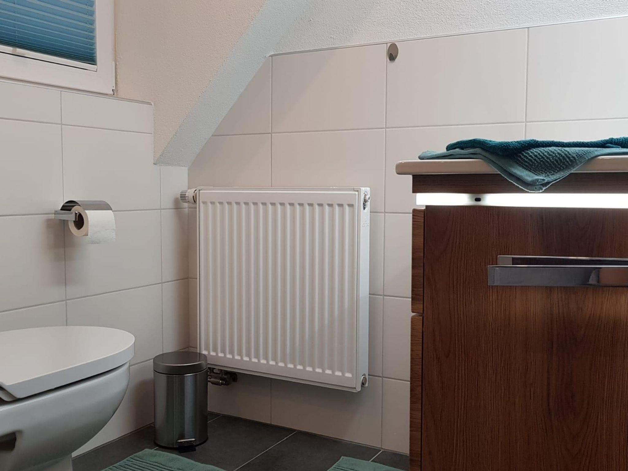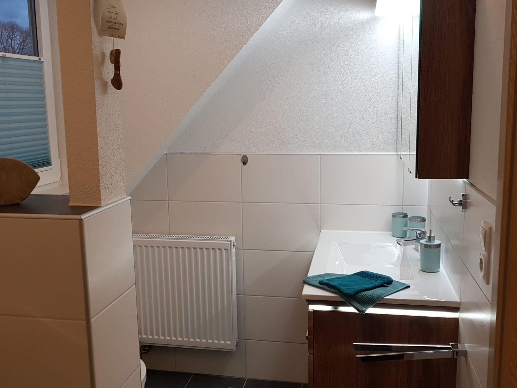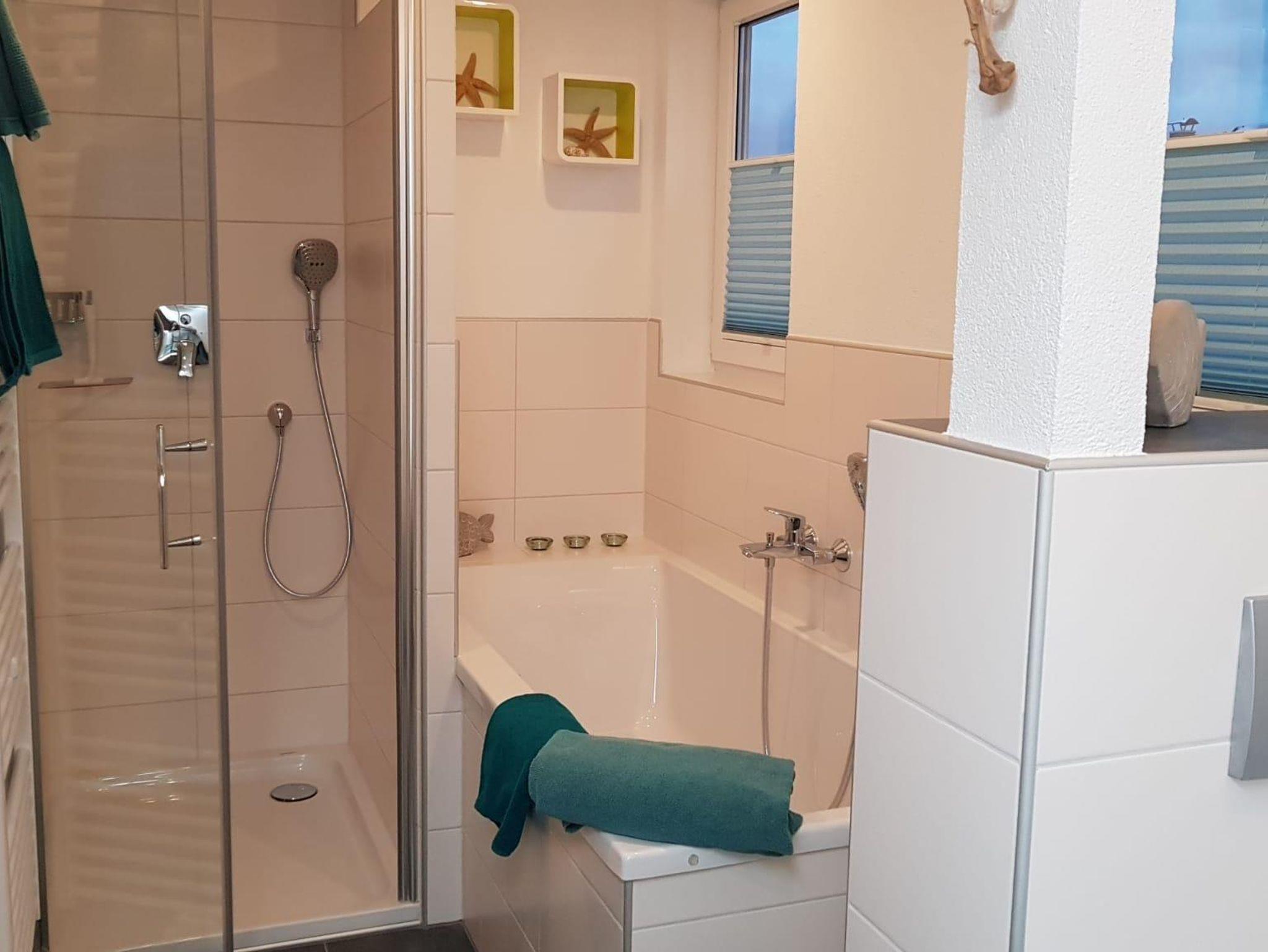 Die Ferienwohnung im Obergeschoss bietet Platz für 4 Personen und besteht aus einem separaten Schlafzimmer und Ess- Wohnzimmer mit Sofabett. Die Küche ist mit Spülmaschine, Mikrowelle, Kühlschrank mit Gefrierfach und Kaffee-Pad-Maschine ausgestattet. Im Badezimmer steht Dusche, Badewanne und Föhn zur Verfügung.