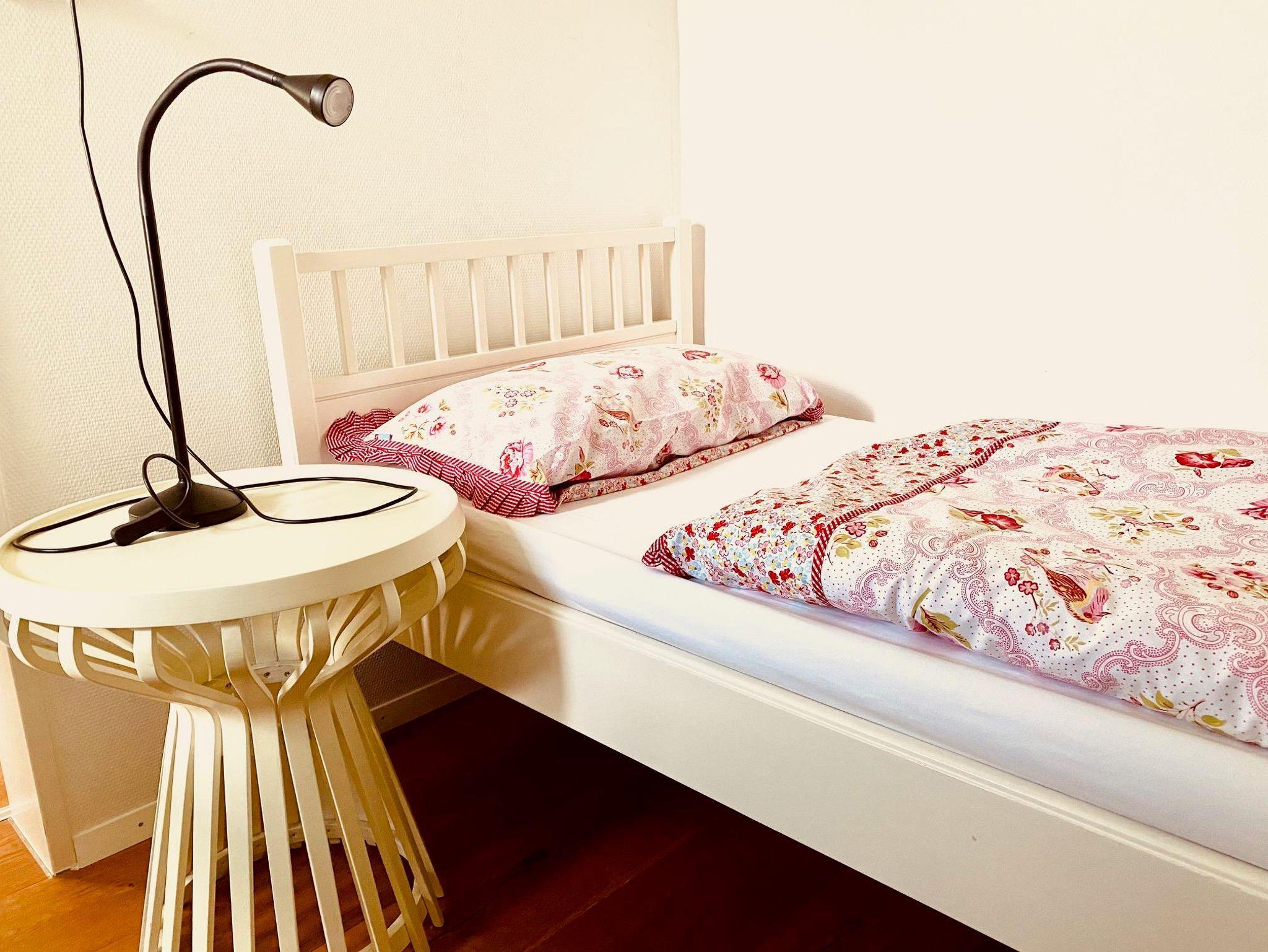 Schöne und gemütliche zweigeschossige Ferienwohnung mit einer kleinen Wohnküche im Erdgeschoss, einem schönen Sitzplatz im Garten, im 1. Stock ein Badezimmer, ein grosses Schlafzimmer und davon abgehend ein kleines Kinderzimmer mit Einzelbett. Die Wohnung hat einen Eichendielenboden.