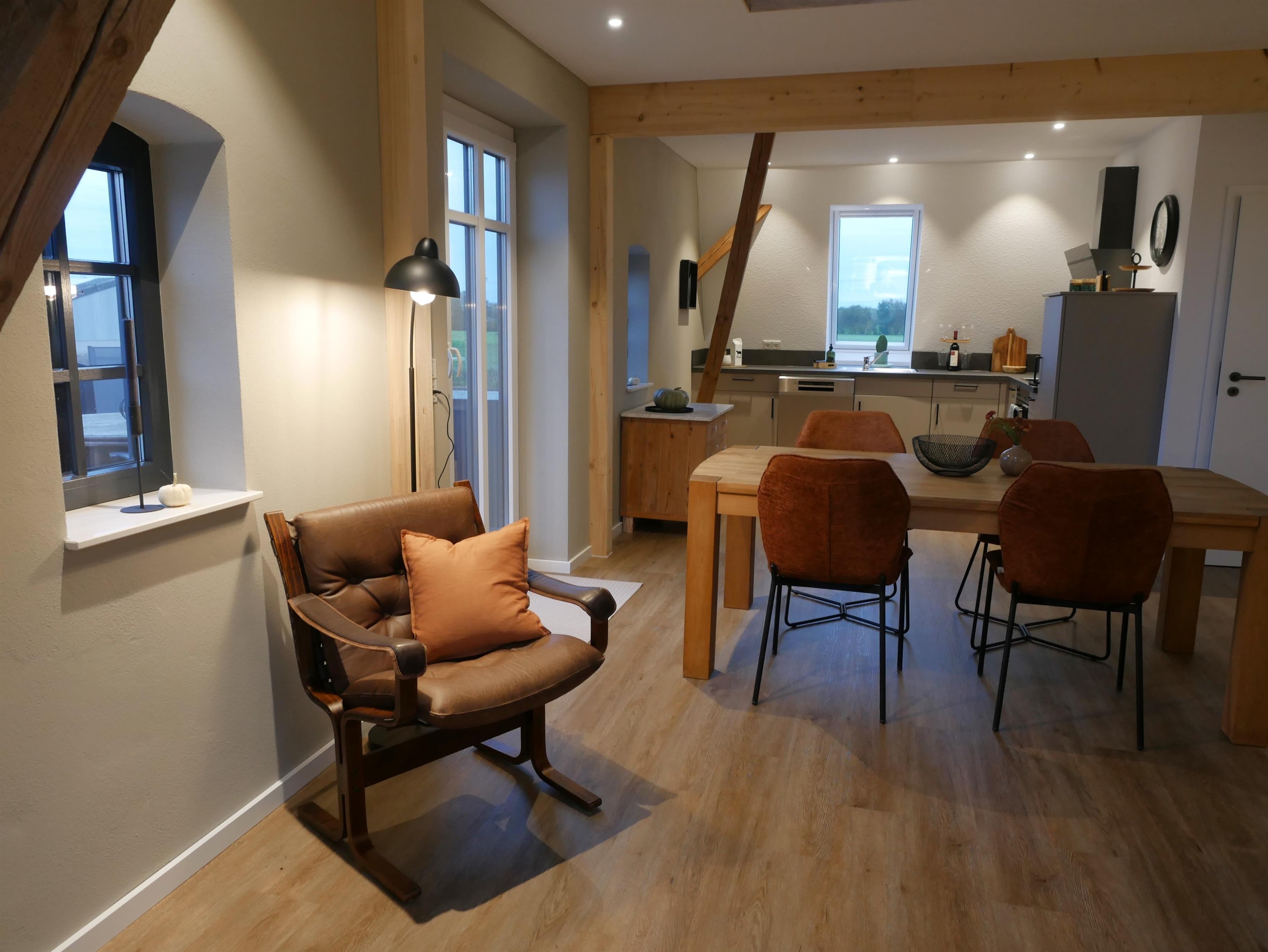 Weidehof – Urlaub auf dem Land zwischen den Meeren – Unser liebevoll renovierter Weidehof bietet zwei gemütliche Ferienwohnungen im ehemaligen Heuboden, ideal für alle, die Ruhe und Natur genießen möchten. Mit offener Wohnküche, zwei Schlafzimmern, Galerie mit Schlafsofa und Balkon mit Blick über die Felder lädt der Hof zum Entspannen, Kochen und Erleben ein – ergänzt durch Kochabende und einen Yogaraum.