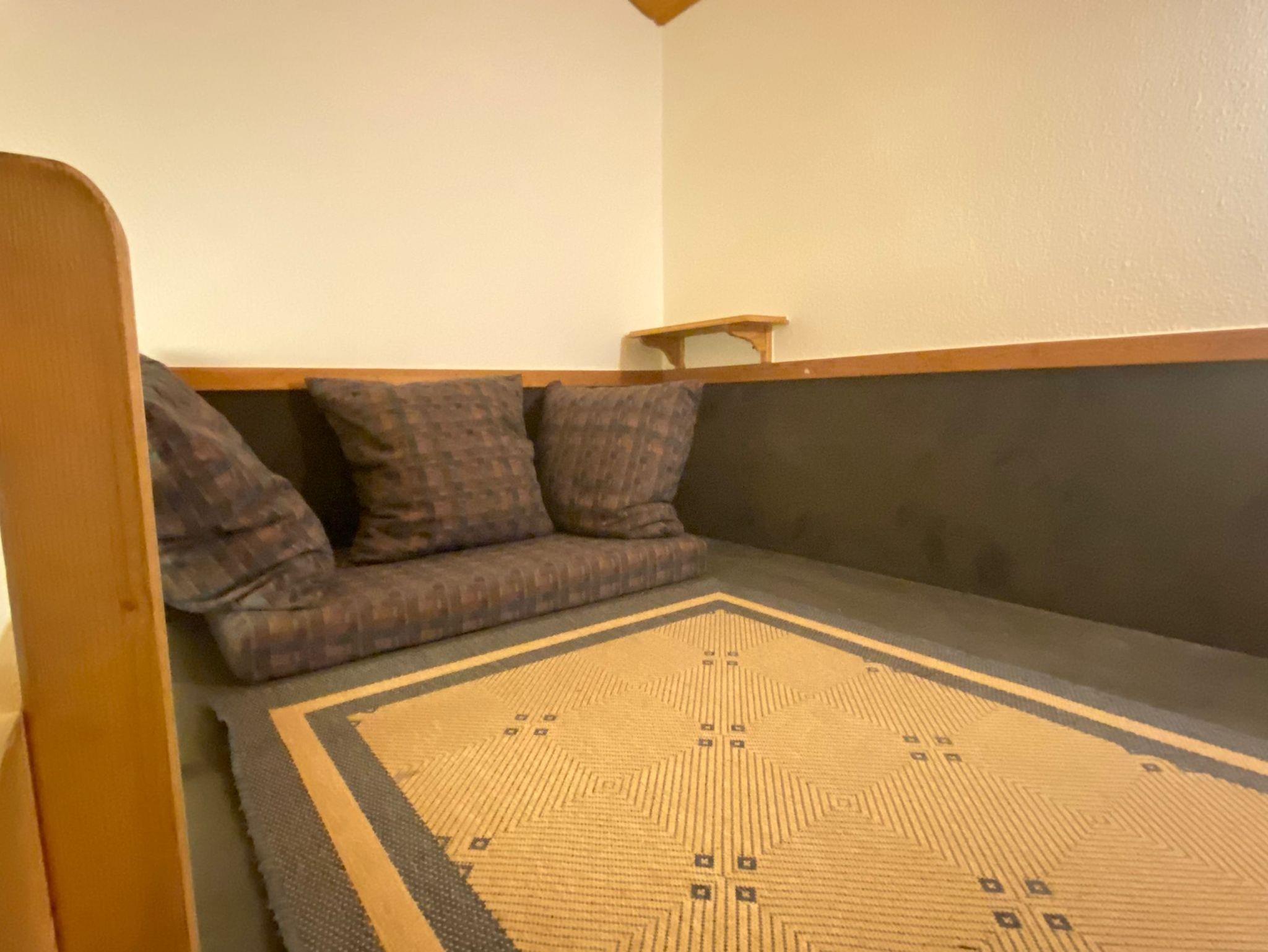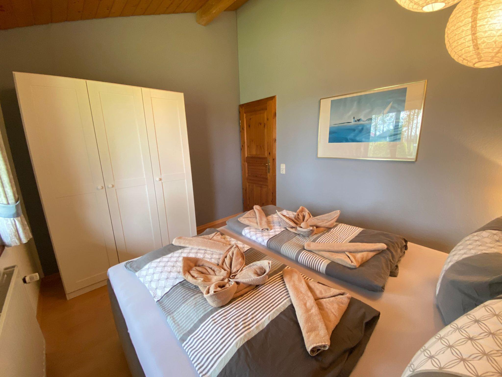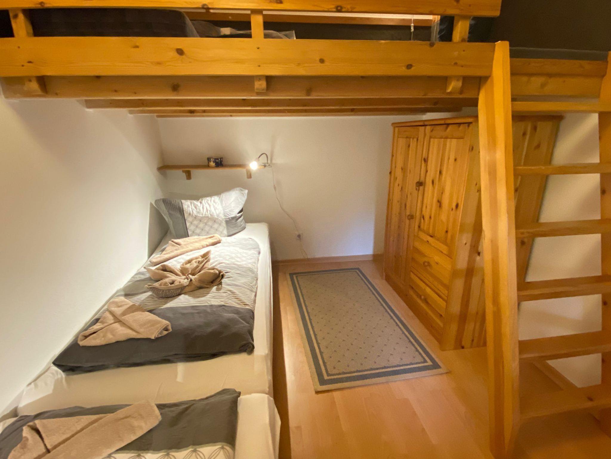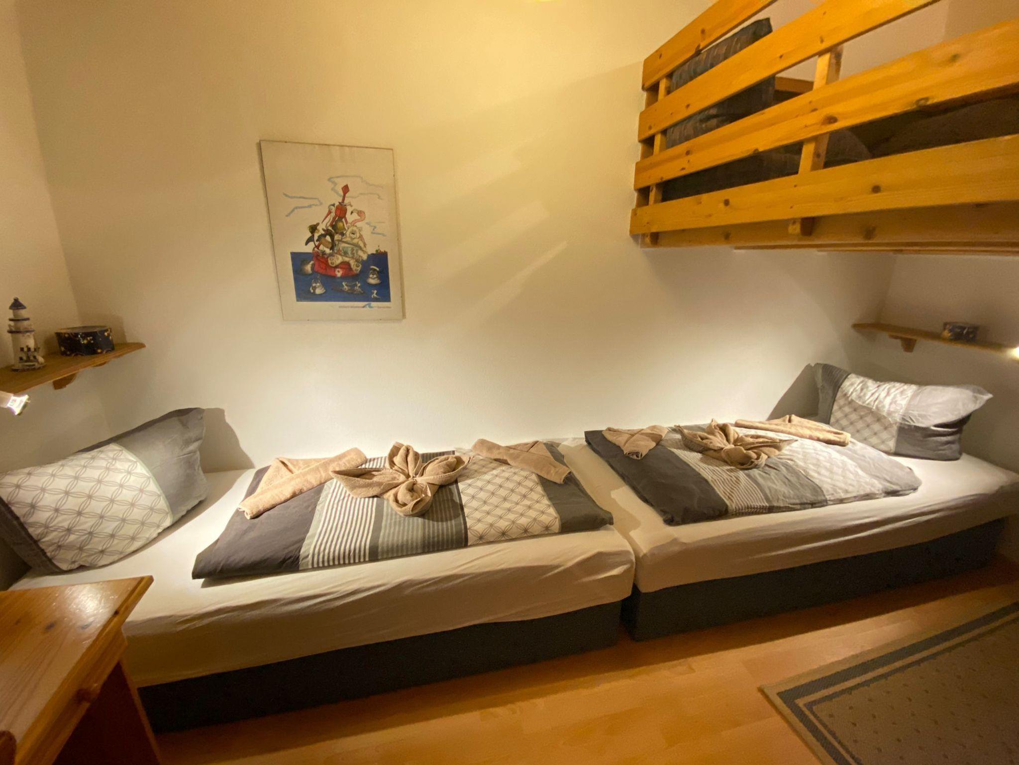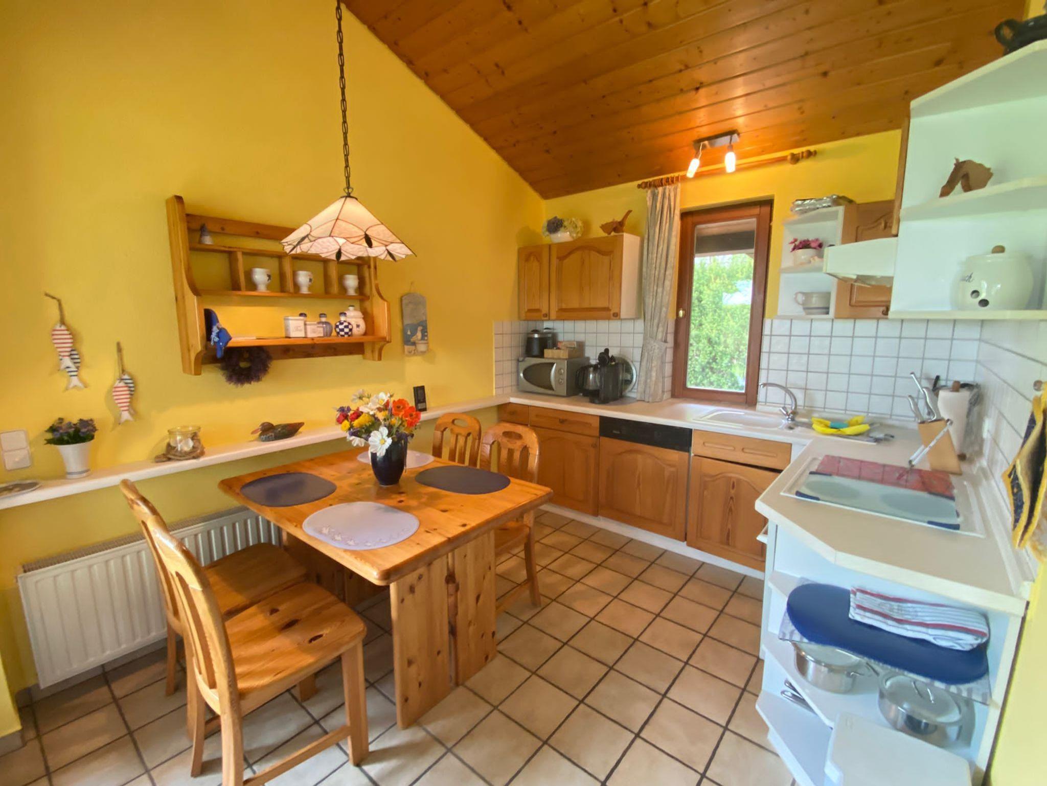 Der Wohnbereich hat gemütliche Sitzgelegenheiten und einen Kamin. Die Küche mit integriertem Essplatz bietet alles zum entspannten Kochen. Das Haus verfügt zudem über einen Schlafraum mit Doppelbett sowie einem weiteren Schlafzimmer mit insgesamt 3 Einzelbetten. Dort ist der Aufgang zu einer kleinen Spielempore. Es steht Ihnen ein geräumiges Tageslicht-Duschbad mit viel Platz zur Verfügung.