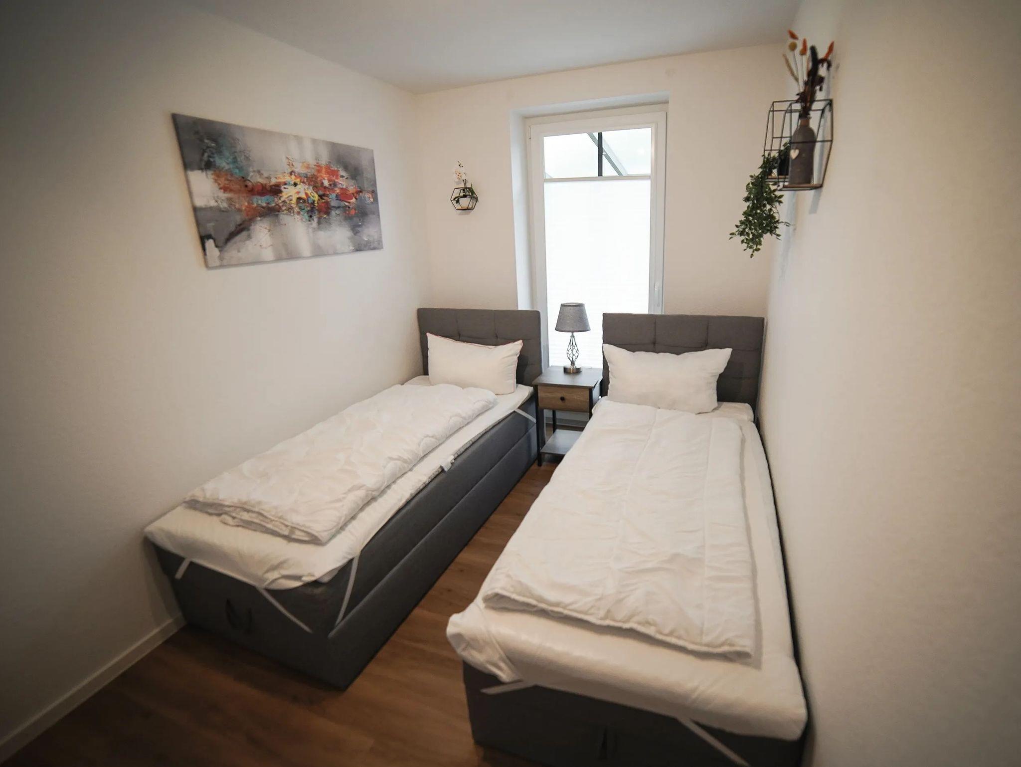 • Schlafzimmer 2 im Erdgeschoss: 2 Einzelbetten 100x200 cm (Boxspring)