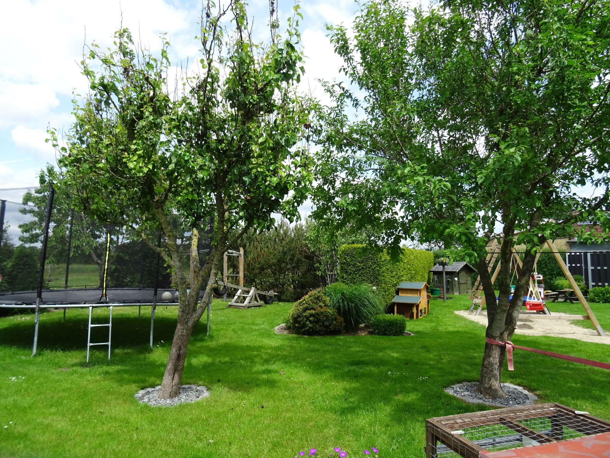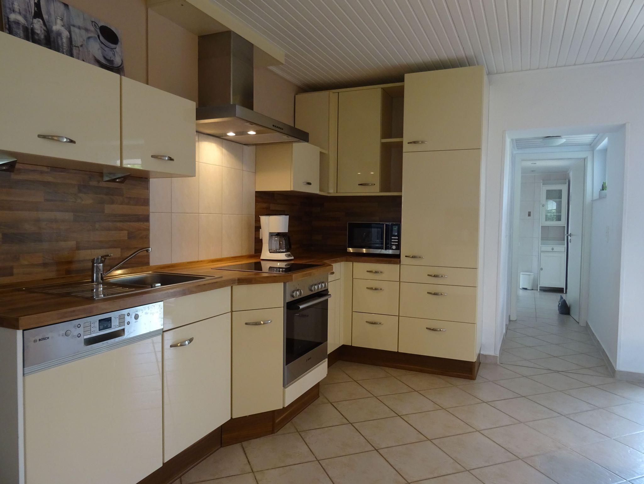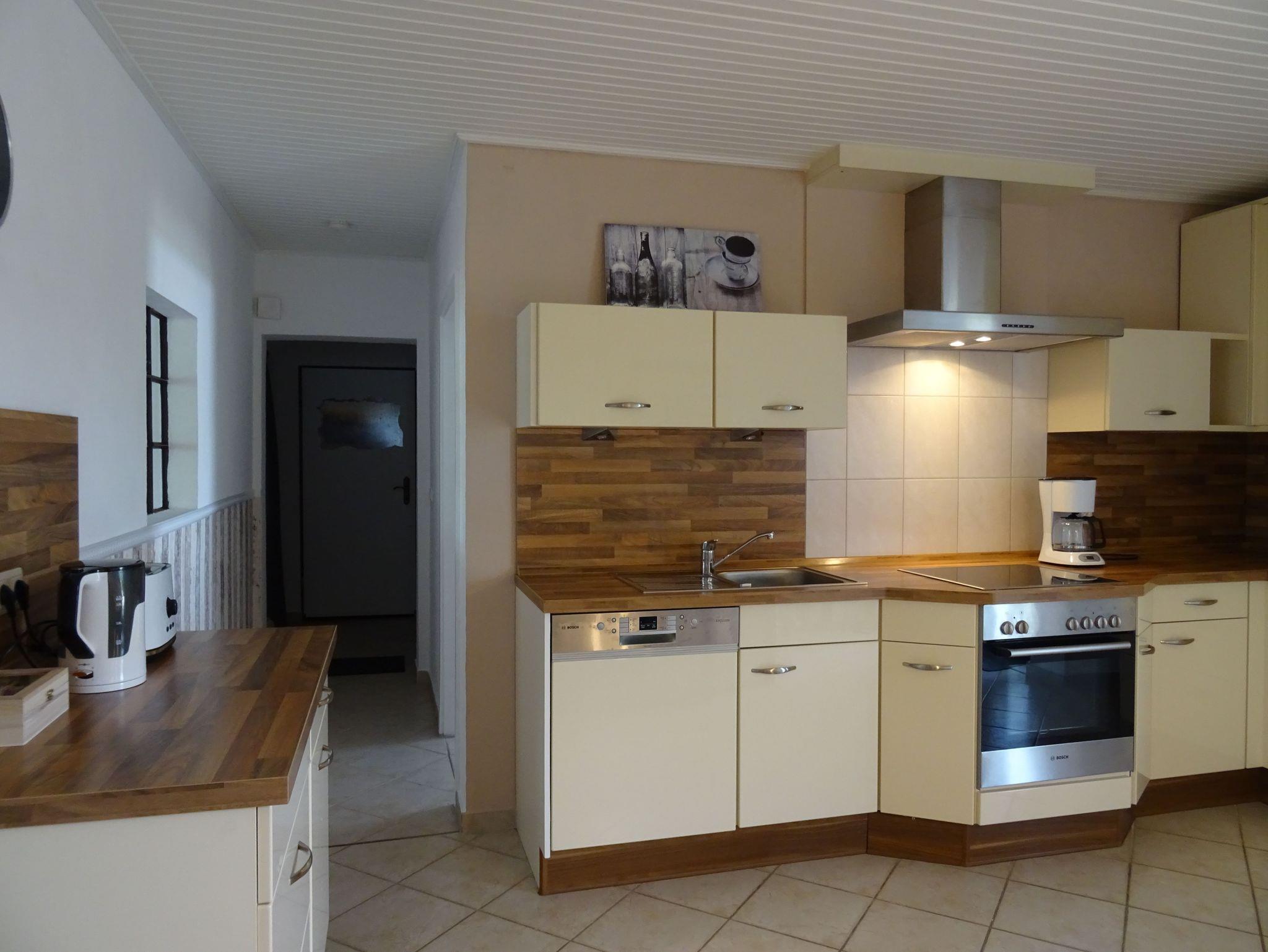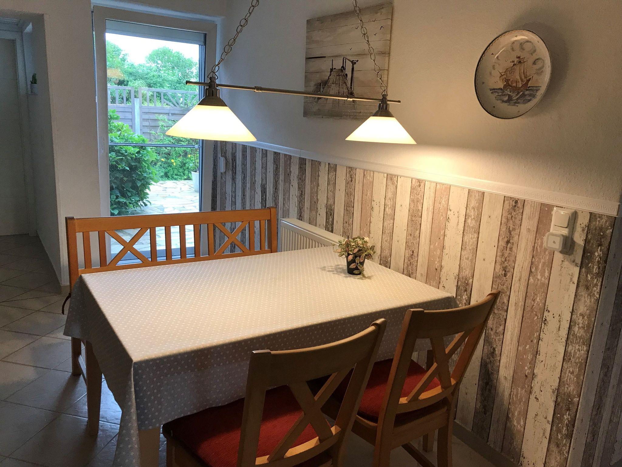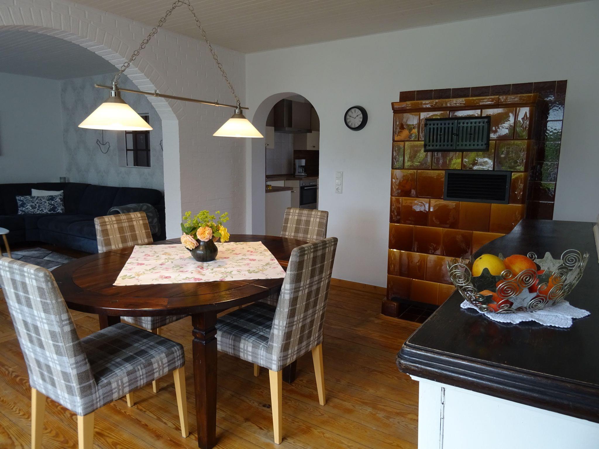 Die Ferienwohnung verfügt über ein großes Wohn- und Esszimmer mit Holzdielenboden und antikem Kachelofen, einer Einbauküche mit Esstisch und Zugang zur Terrasse mit Garten und Spielgeräten sowie einem Badezimmer mit ebenerdiger Dusche und Badewanne. Es gibt drei Schlafräume: ein Schlafzimmer mit Doppelbett, davon abgehend ein Schlafraum mit französischem Bett und ein weiterer separater Schlafraum mit einem französischen Bett (1,40 x 2,00m).