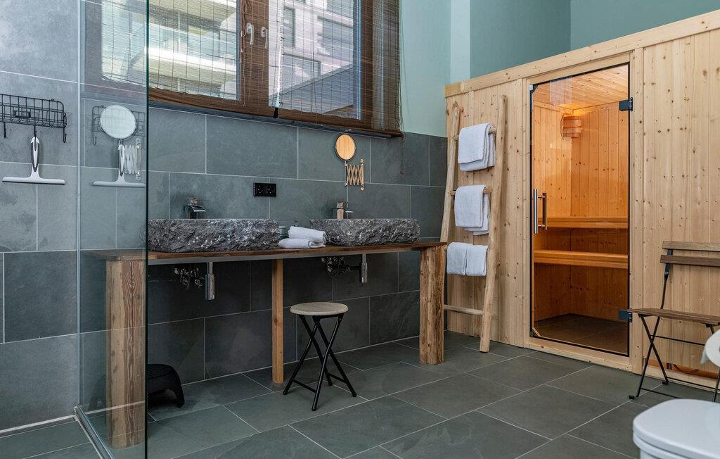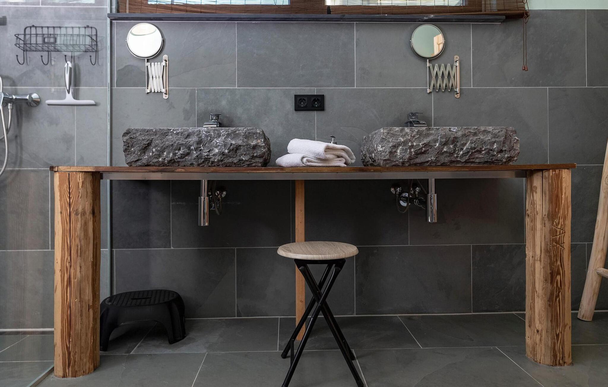 Bruserummet i natursten lavet af brasiliansk skifer har en finsk sauna og håndlavede flodstensvaske. Et gæstetoilet giver ekstra komfort.