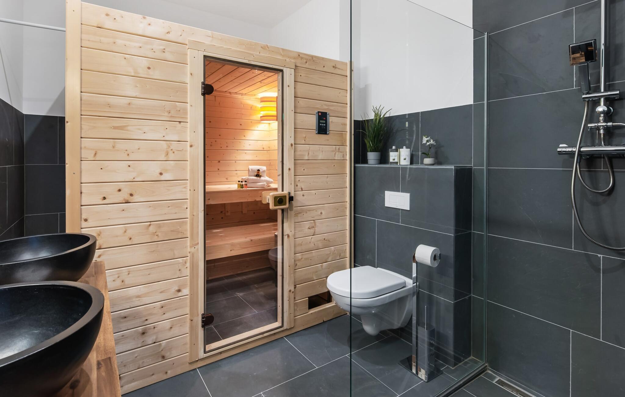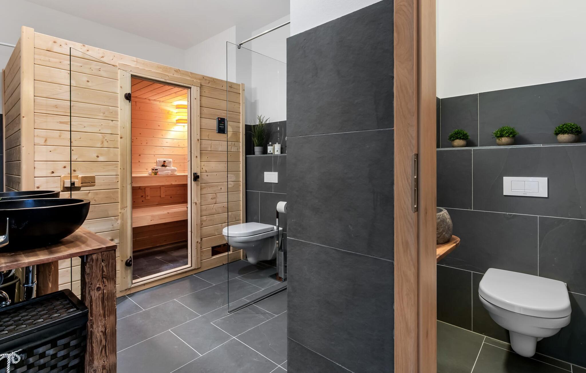 Bruserummet i natursten lavet af brasiliansk skifer har en finsk sauna og håndlavede flodstensvaske. Ægte SPA-øjeblikke kan opleves her! Et gæstetoilet giver ekstra komfort.