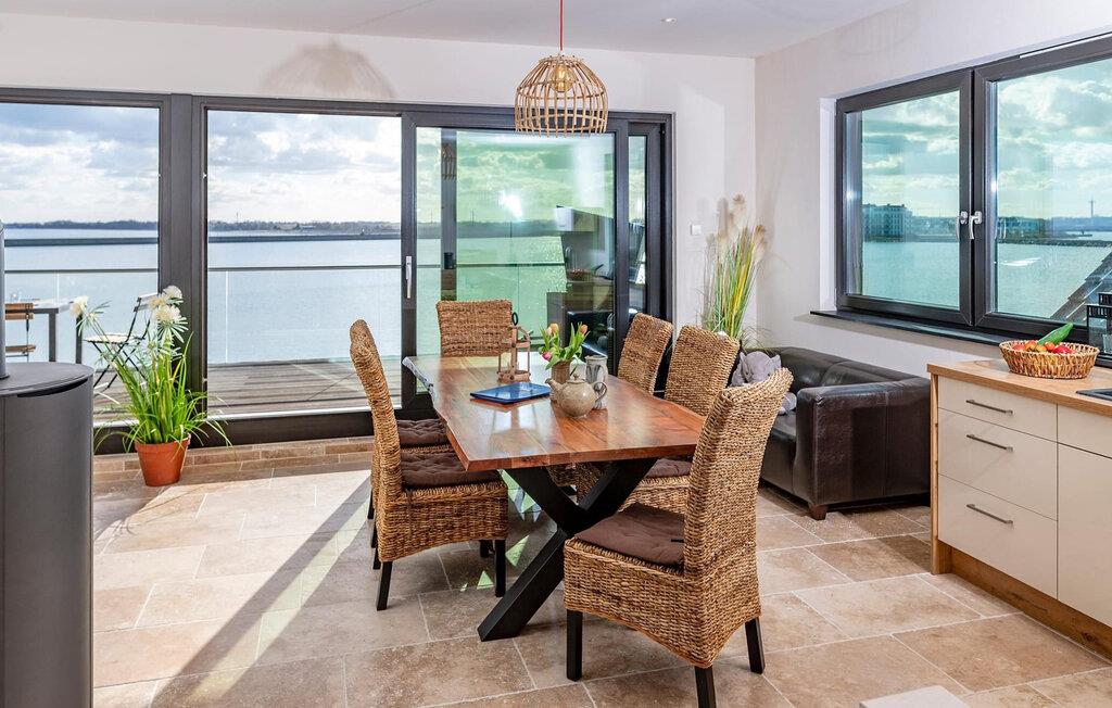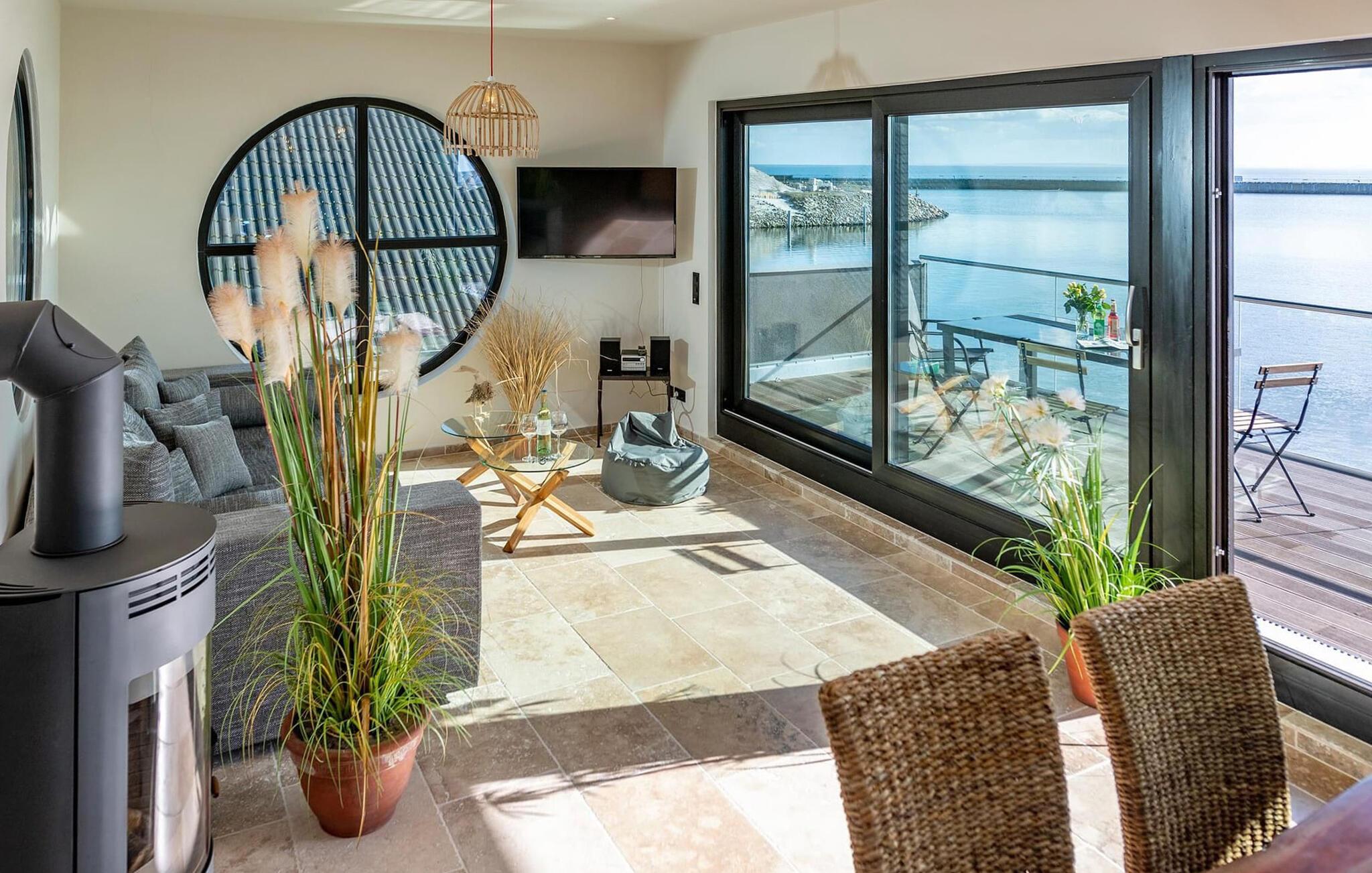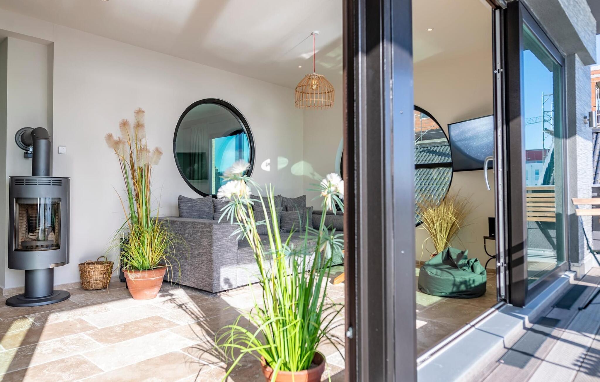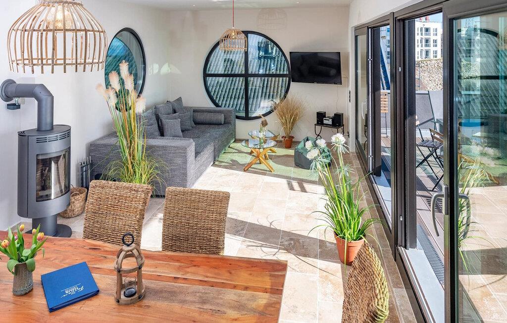 Den sydvendte orientering af den rummelige terrasse ved lystbådehavnen lover solskin hele dagen lang, mens pejsen og gulvvarmen i hele ferielejligheden sørger for behagelig komfort i hver sæson.