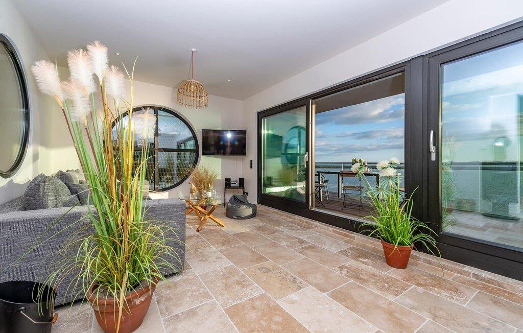 Beliggende PÅ Østersøen på et smalt næs mellem sejler- og sportsbådshavnen i Baltic Sea Resort Olpenitz og Østersøens vidde, imponerer denne ferielejlighed med sin direkte vandbeliggenhed og det betagende hav og panoramaudsigt fra hele opholds- og spiseplads samt master bedroom Den hvide sandstrand The Baltic Sea Resort Olpenitz ligger blot et par hundrede meter væk Sejlskibe kommer gennem havneindløbet foran vinduerne.