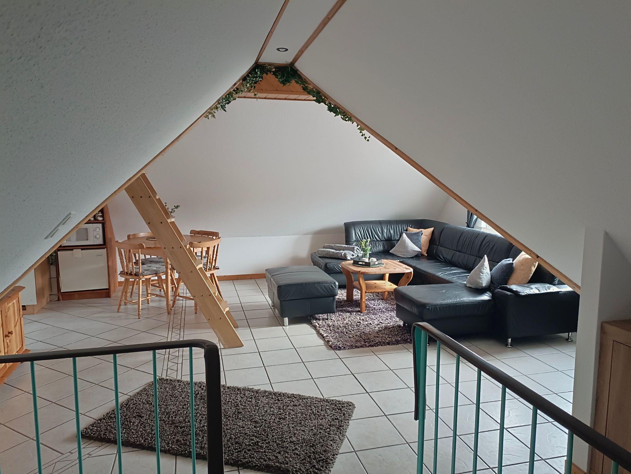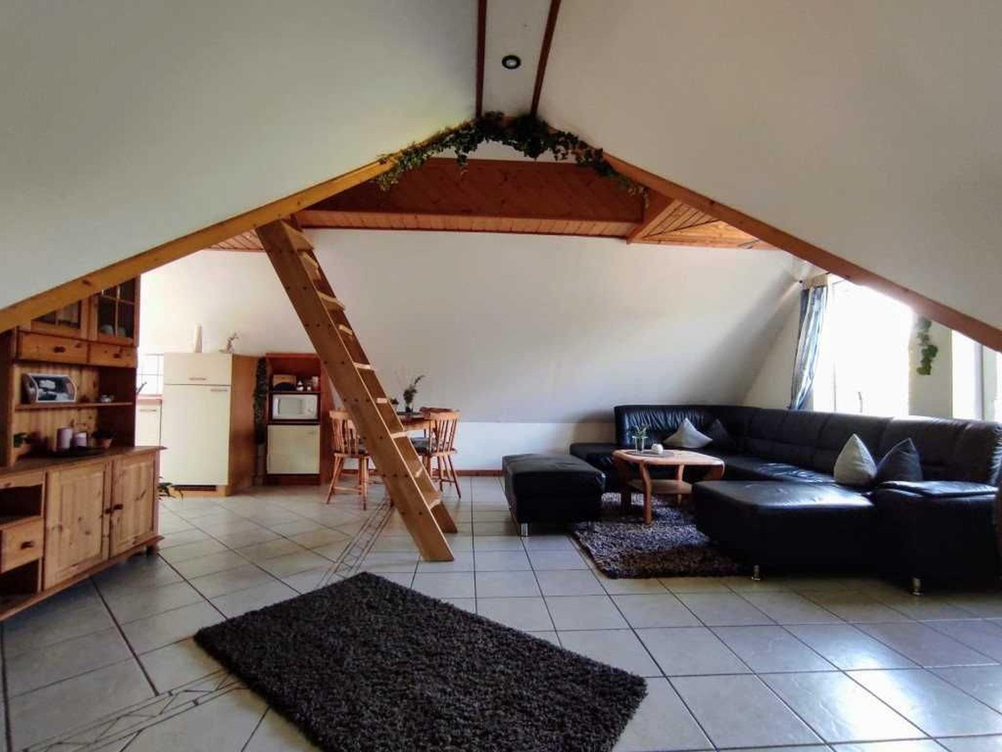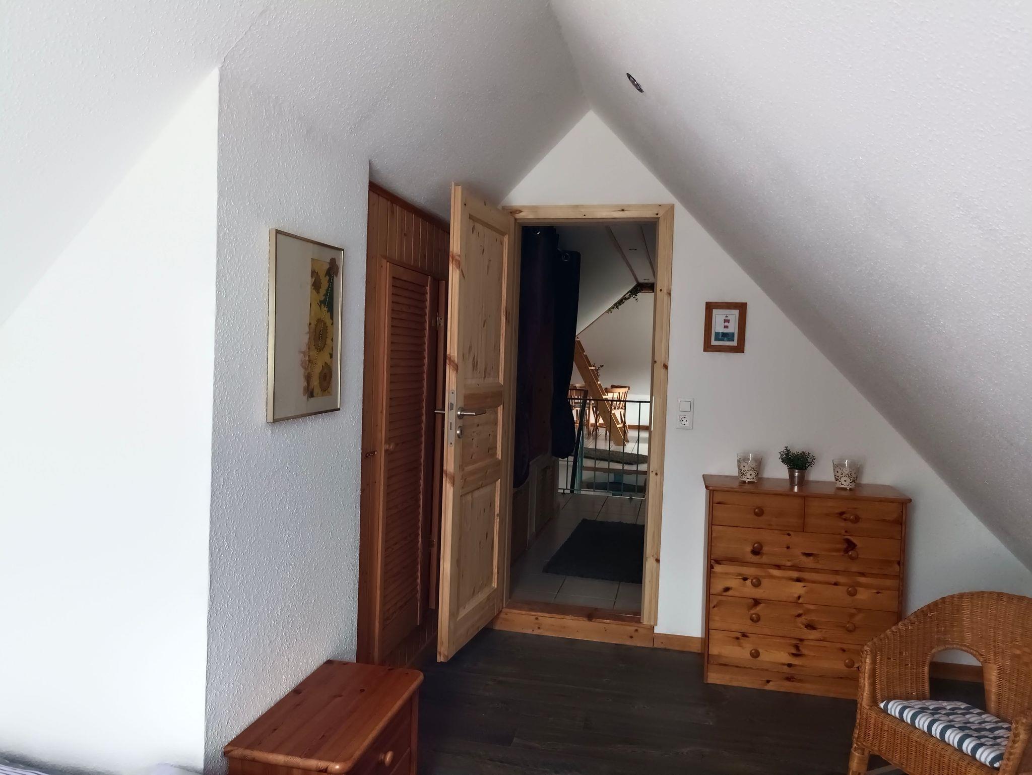 Die geräumige Oberwohnung bietet ein Schlafzimmer mit Doppelbett für zwei Personen sowie eine Koje im Wohn-/Essbereich für eine Person. Im großen Wohn-/Essbereich finden Sie ein großes Ecksofa, ein Essbereich und eine kleine Küchenzeile. Das helle Badezimmer ist mit einer Dusche und WC ausgestattet. Die Oberwohnung erreichen Sie über eine Treppe mit separaten Eingang. Bis zu zwei Hunde/Haustiere sind erlaubt. Nichtraucherwohnung.