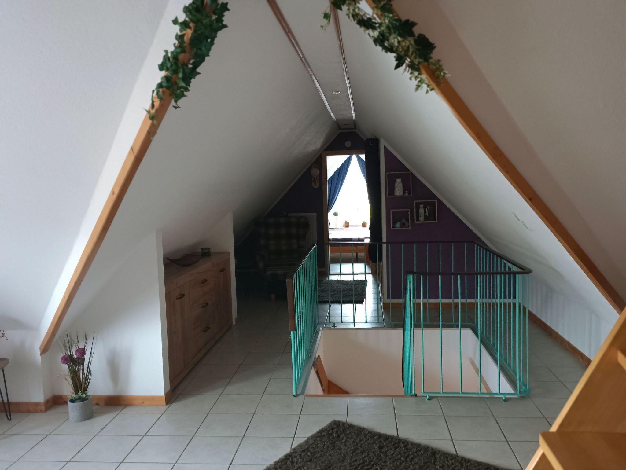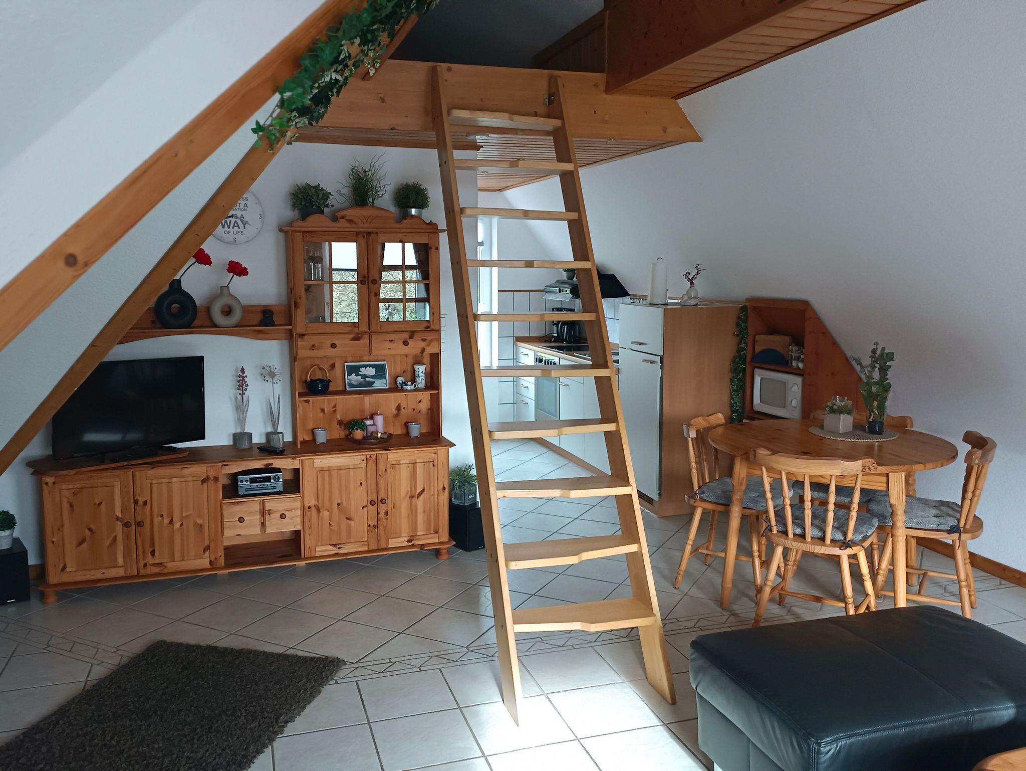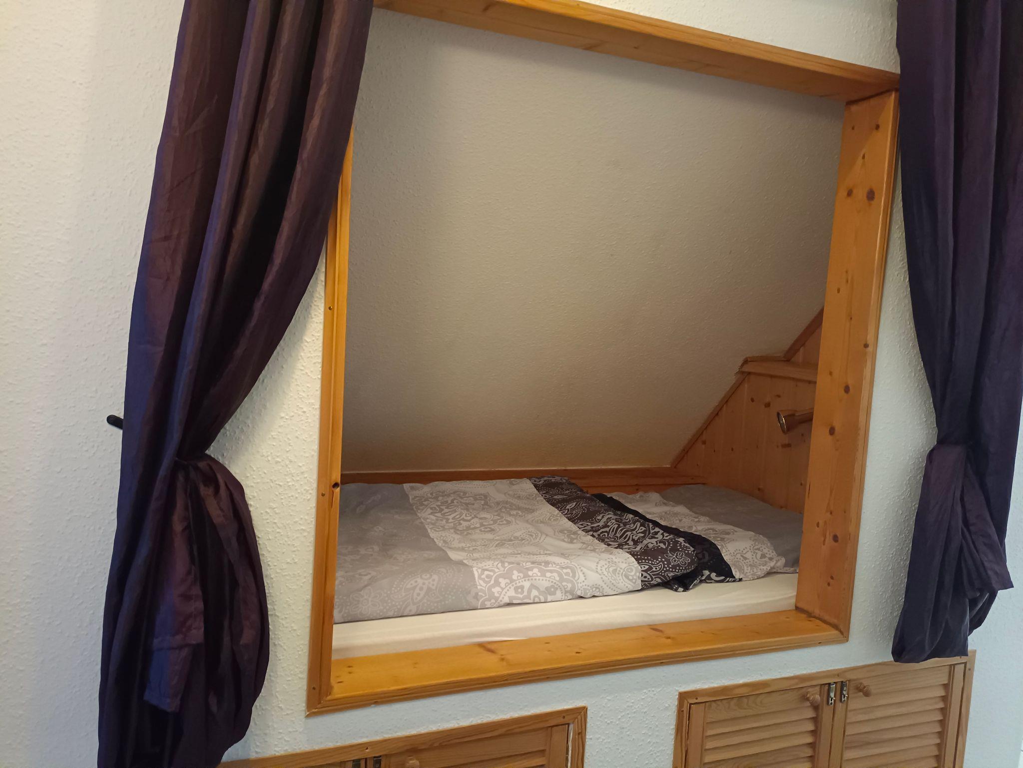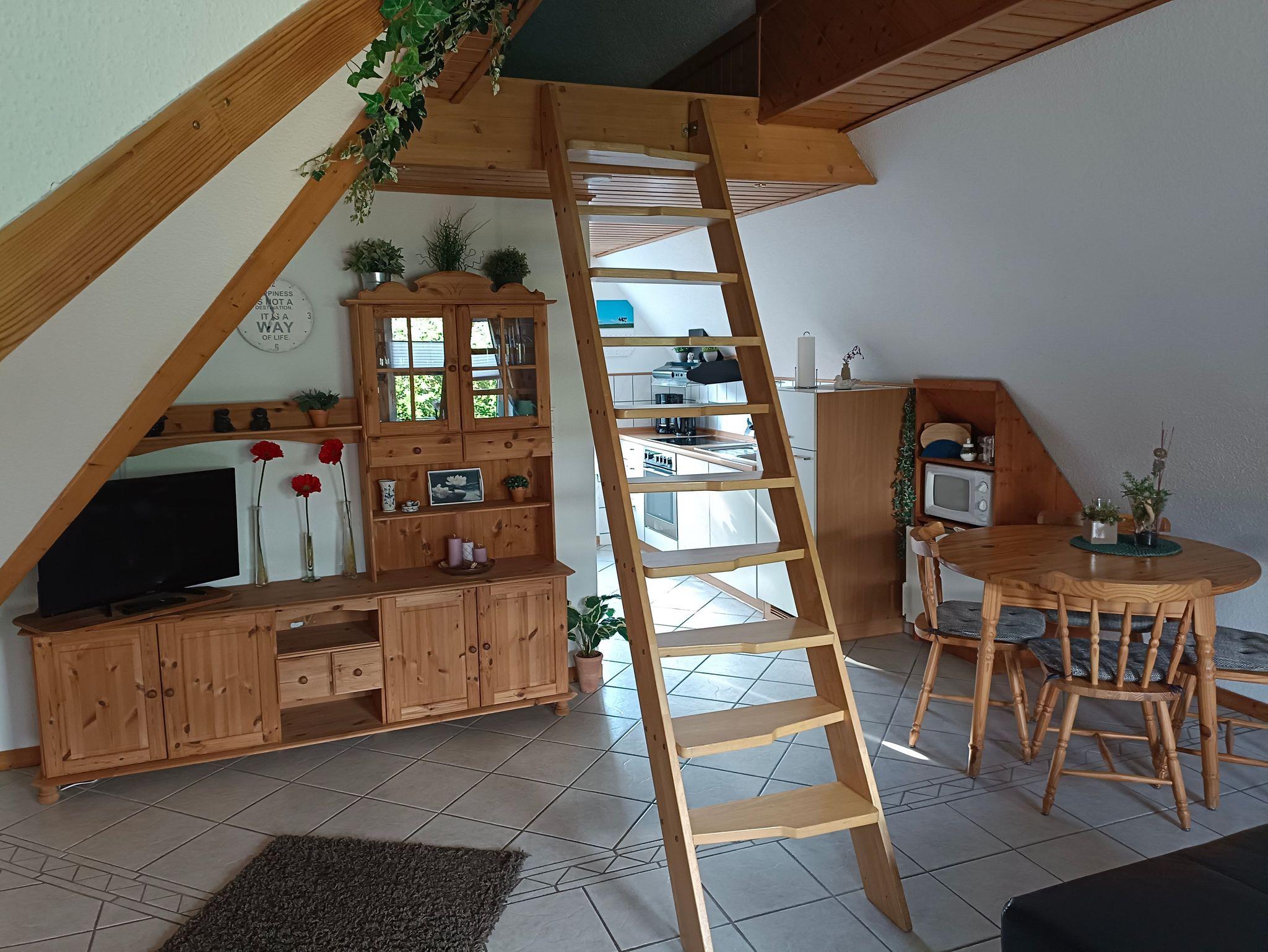 Die geräumige Oberwohnung bietet ein Schlafzimmer mit Doppelbett für zwei Personen sowie eine Koje im Wohn-/Essbereich für eine Person. Im großen Wohn-/Essbereich finden Sie ein großes Ecksofa, ein Essbereich und eine kleine Küchenzeile. Das helle Badezimmer ist mit einer Dusche und WC ausgestattet. Die Oberwohnung erreichen Sie über eine Treppe mit separaten Eingang. Bis zu zwei Hunde/Haustiere sind erlaubt. Nichtraucherwohnung.