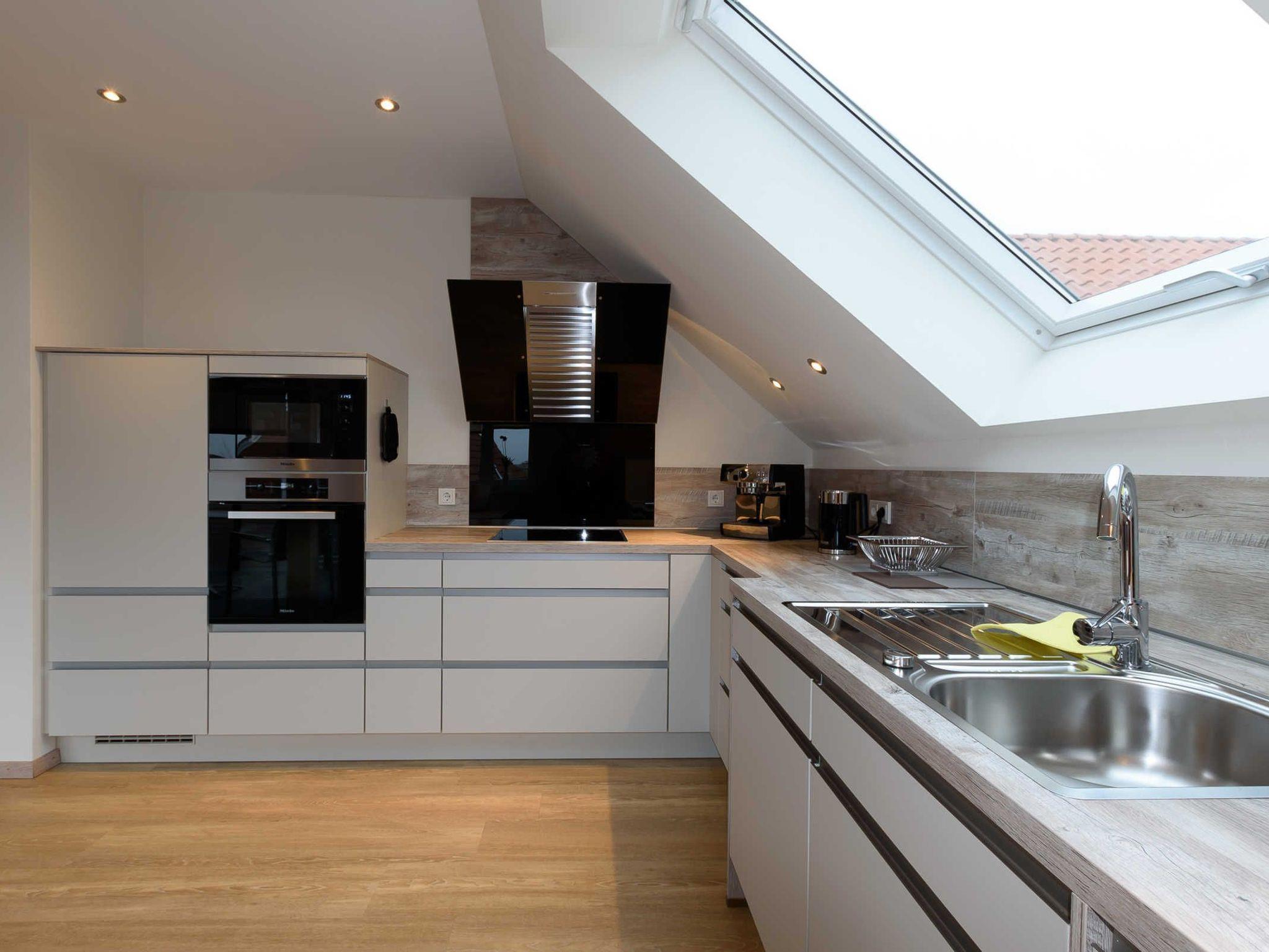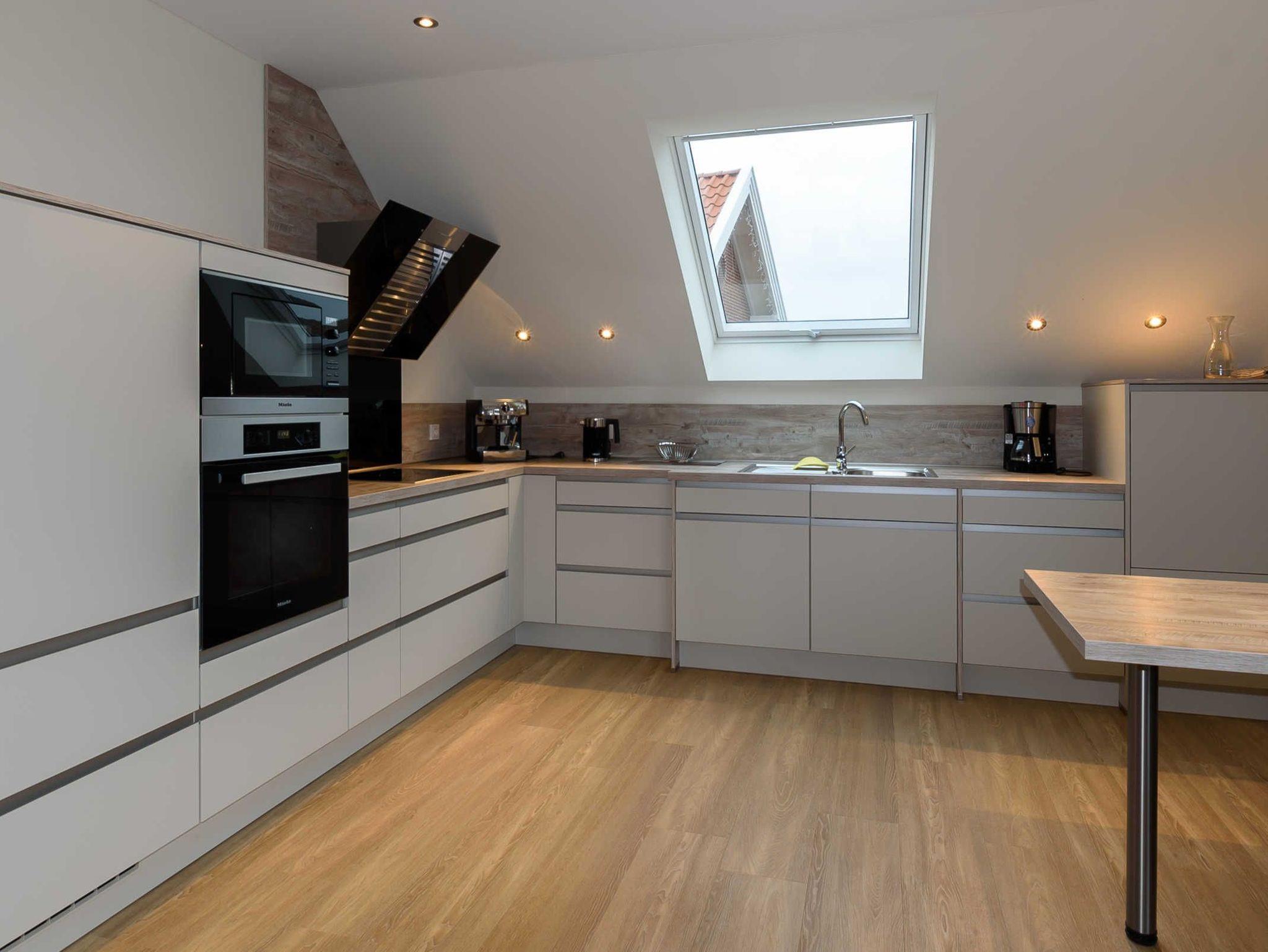 Moderne Küche mit Miele-Einbaugeräten sowohl Siebträger- als auch herkömmliche Kaffeemaschine Eier- und Wasserkocher, Mixer komplettes Koch- und Backgeschirr kleiner Tisch mit Sitzmöglichkeit für 2-3 Personen