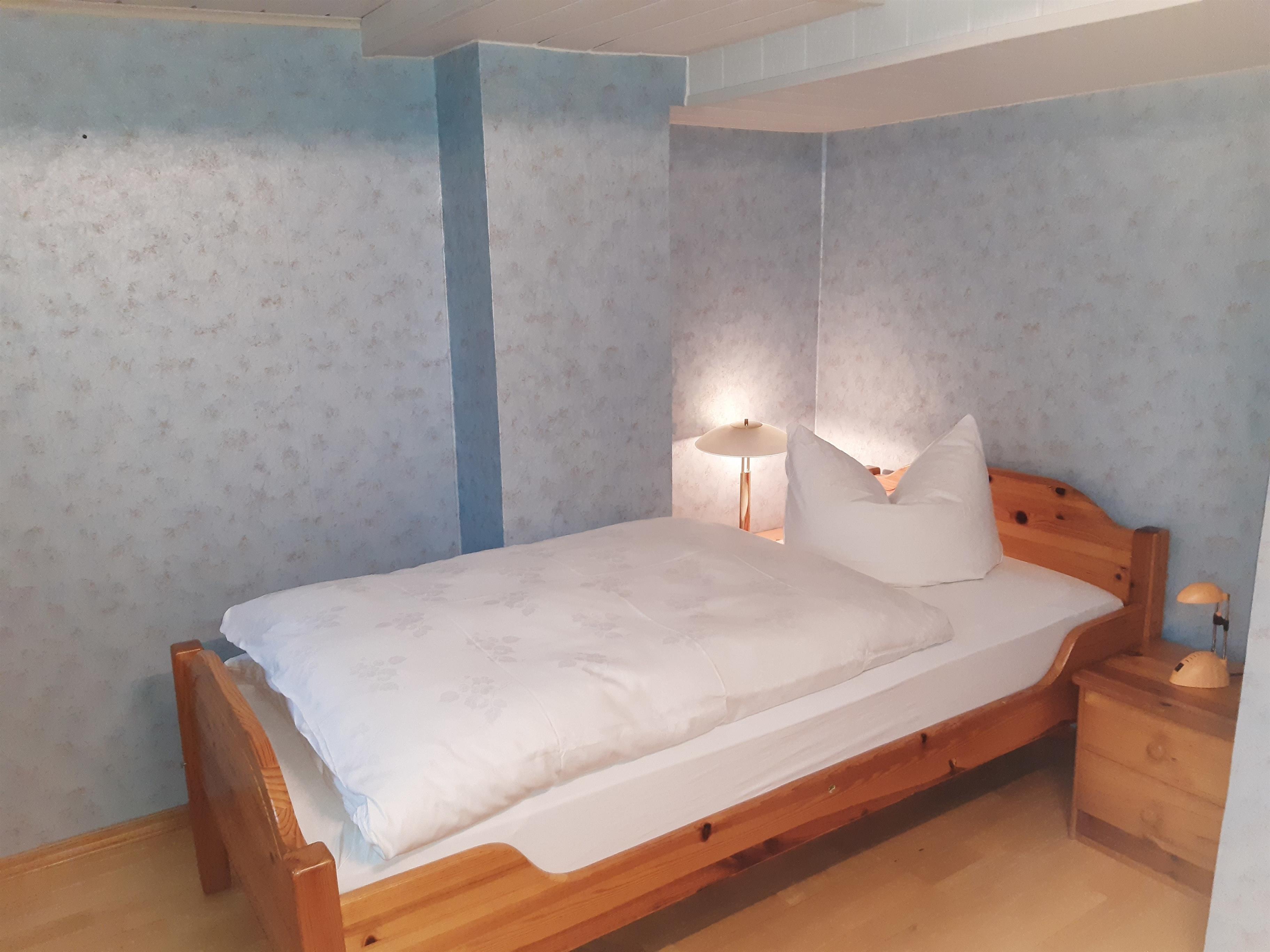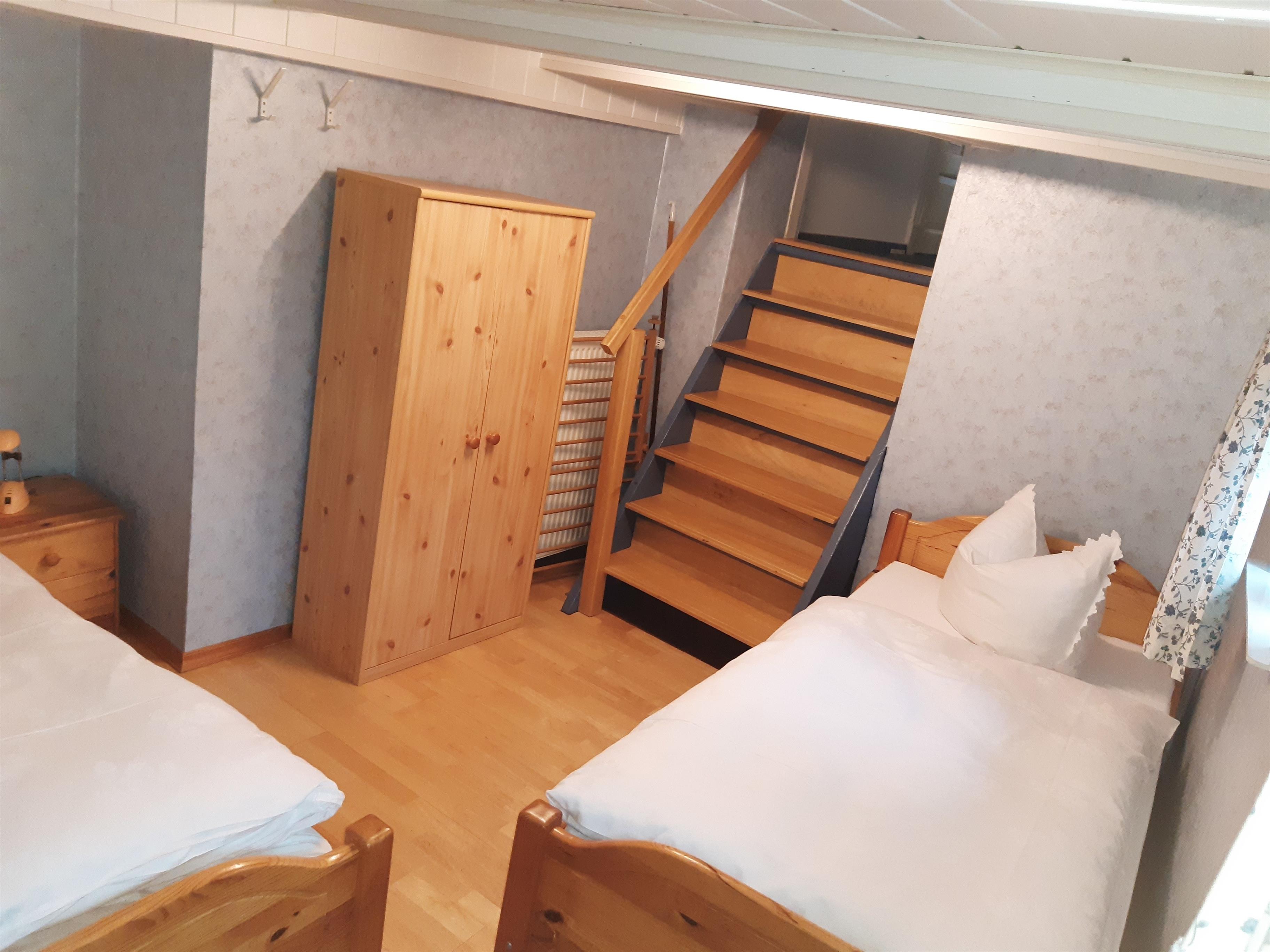 Das Schlafzimmer mit den zwei Einzelbetten ist über eine steile Treppe (siehe Fotos) zu erreichen, die oben im Flur mit einem Kindersicherheitsgitter abgetrennt werden kann (oder man schließt einfach die Tür).