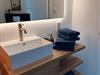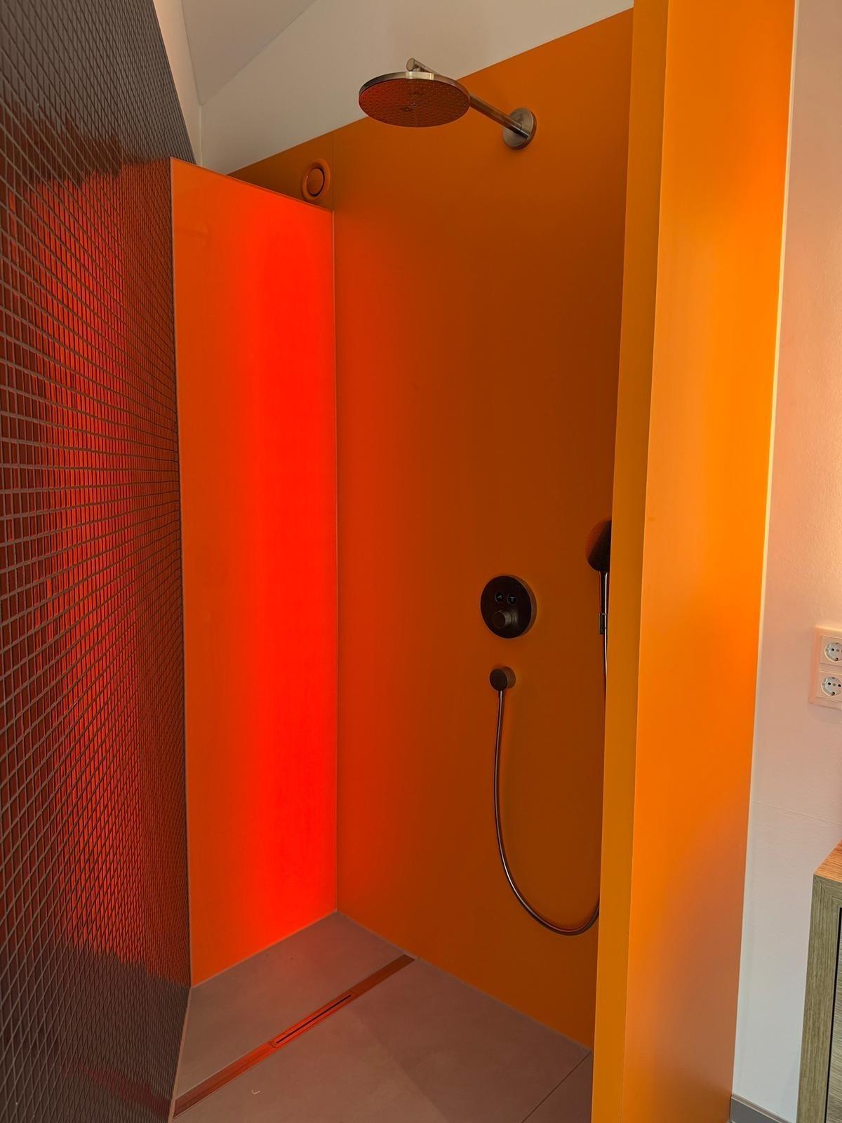 In diesem Ferienzimmer erwartet Sie ein luxuriöses Badezimmer, das mit einer atemberaubenden Regenwalddusche ausgestattet ist. Das sanfte Rauschen des Wassers bringt Ihnen nicht nur Entspannung, sondern erzeugt auch positive Energie, die Ihren Geist und Körper revitalisiert. Besonders die orange hinterleuchtete Dusche sorgt für eine angenehme Atmosphäre und ein Gefühl der Wärme, das Ihren Aufenthalt zu einem unvergesslichen Erlebnis macht. Lassen Sie die Sorgen des Alltags hinter sich und genießen Sie das erfrischende Erlebnis in Ihrem eigenen kleinen Paradies.