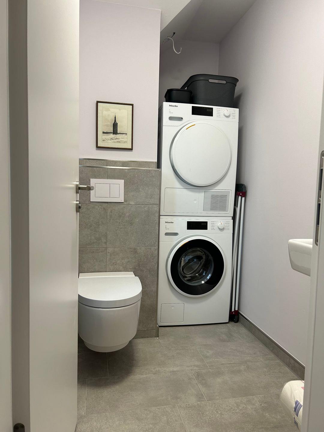Waschmaschine und Trockner stehen im Gäste-WC zur Verfügung. Die 50qm große Dachterrasse ist nach Süden ausgerichtet und komplett mit Terrassenmöbeln und Liegen ausgestattet. Sie lässt einen herrlichen Blick über die Dächer von Jever auf die Türme der Stadtkirche und des Schlosses zu.