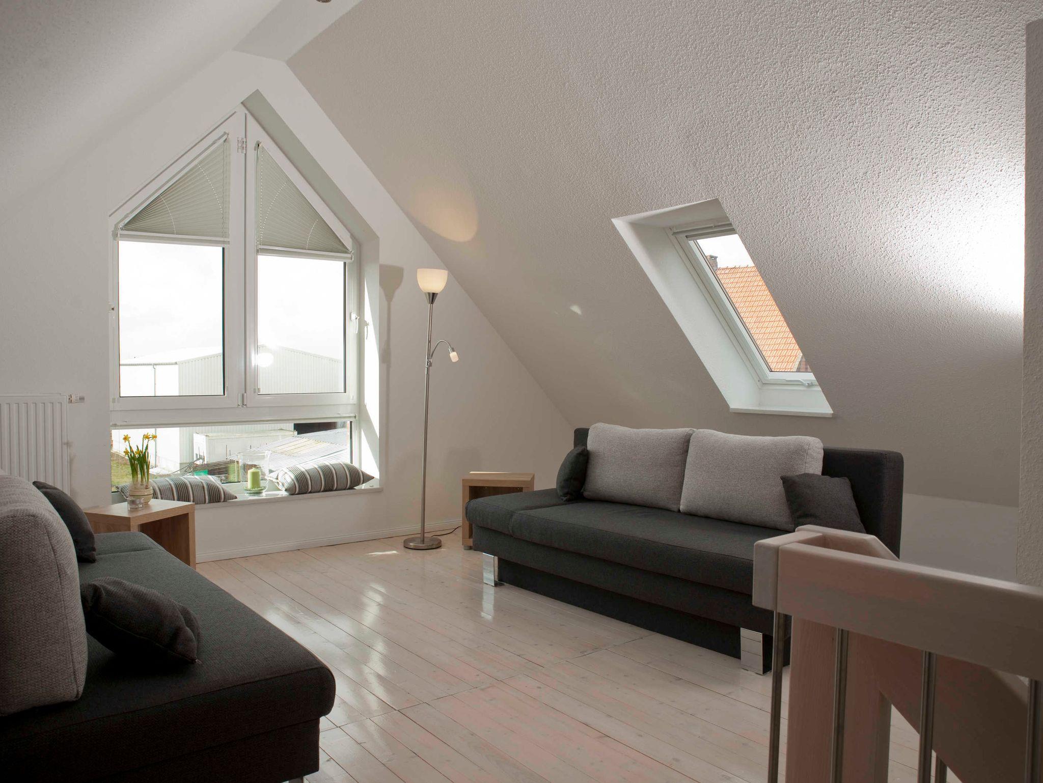 Separater Schlafraum, offener Schlafraum über dem Wohnzimmer mit Küchenzeile, Dusche und Balkon. Nicht für Monteure geeignet!