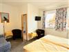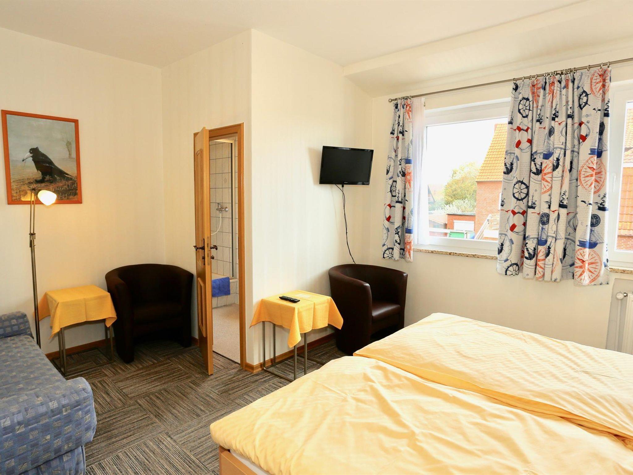 Unser Nichtraucher-Familienzimmer ist als komfortables Dreibettzimmer mit Dusche/WC ausgestattet und bietet Ihnen Annehmlichkeiten wie einen Kabel-TV. Die hochwertigen Seniorenbetten mit verstellbaren Lattenrosten und Kaltschaummatratzen sorgen für besonderen Schlafkomfort. Als Highlight genießen Sie vom Zimmer aus einen reizvollen Hafenblick im 45-Grad-Winkel.