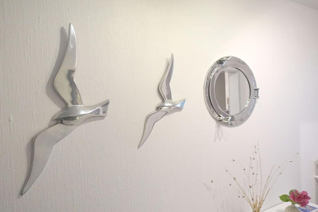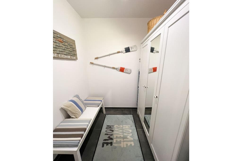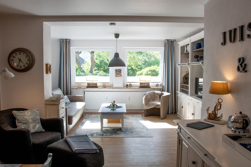Die liebevoll maritim, modern eingerichtete Wohnung Bullauge erstreckt sich über zwei Etagen und ist etwa 65m² groß. Der Flur, der separate Garderobenraum, die Küche und der große, lichtdurchflutete Wohn-Essbereich befinden sich im Erdgeschoss. Das geräumige Schlafzimmer mit zwei Fenstern, sowie das Duschbad liegen im Souterrain. Neben dem Doppelboxspringbett und einem modernen Wandklappbett im Schlafraum bietet ein komfortables Schlafsofa im Wohnraum zwei weitere Schlafgelegenheiten. Bei einer 3- Personen Belegung ist der Schlafraum ideal. Gerne stellen wir ein Babybett, Treppentörchen und einen Triptrap zur Verfügung. Sat- TV, DVD- Player und freies W- LAN sind vorhanden.
