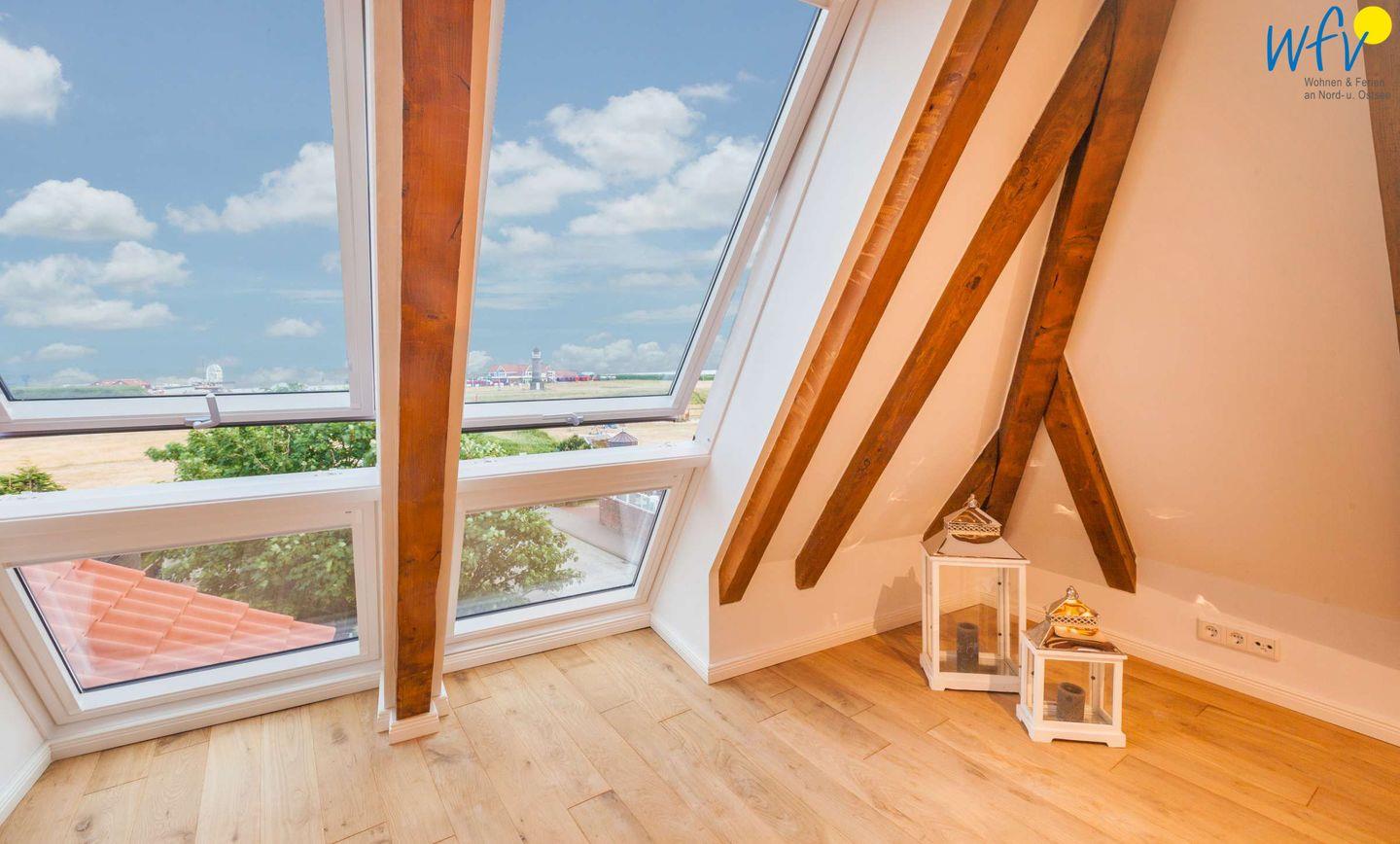 Auf der ersten Etage erwartet Sie ein lichtdurchfluteter Wohn- und Essbereich mit wunderschöner Aussicht. Von hier aus kann man den Leuchtturm, das Seezeichen und den Hafen sehen und sogar die anfahrenden Schiffe beobachten.