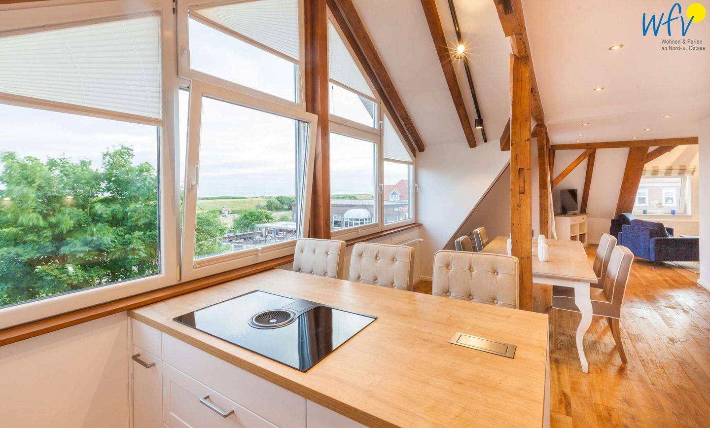 Dieses außergewöhnliche Appartement mit Meerblick bietet Ihnen viel Platz und gleichzeitig Gemütlichkeit. Breite Fensterfronten mit herrlichem Lichteinfall sowie eine Aufteilung über zwei Etagen sorgen für ein weites Raumgefühl. Durch eine hochwertige Einrichtung und stilvolle Accessoires entfaltet sich ein modernes Ambiente mit sehr geschmackvoller Farbgestaltung. Klare Formen korrespondieren mit edlen Materialien; freigelegte Holzbalken und warme Parkettböden verleihen der Ferienwohnung die entsprechende Behaglichkeit. Unsere "Kleine Töwerliebe" ist eine Wohlfühloase für traumhaft erholsame Tage auf Juist!